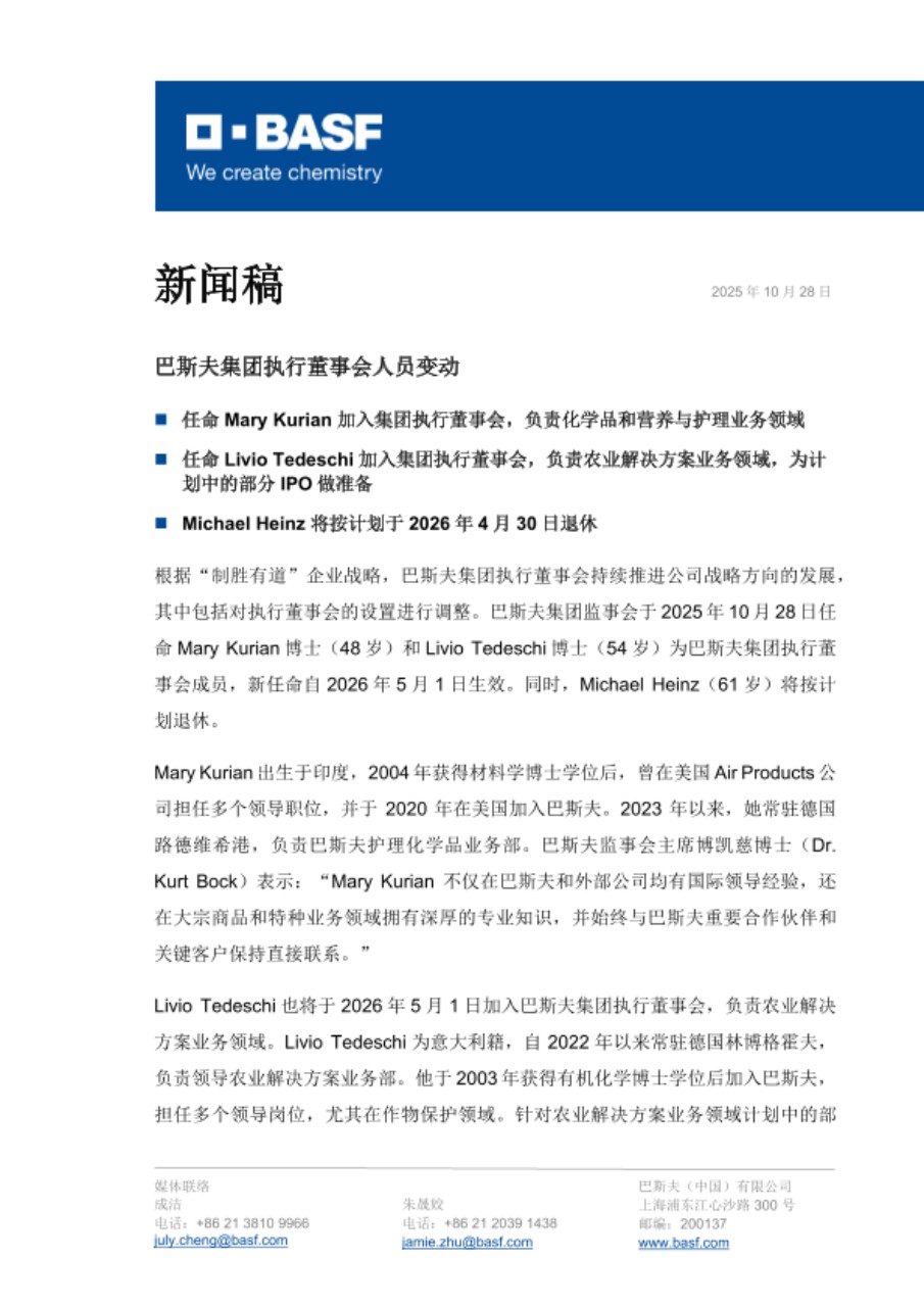 根据“制胜有道”企业战略,巴斯夫集团执行董事会持续推进公司战略方向的发展,其中包括对执行董事会的设置进行调整。巴斯夫集团监事会于2025年10月28日任命Mary Kurian博士(48岁)和Livio Tedeschi博士(54岁)为巴斯夫集团执行董事会成员,新任命自2026年5月1日生效。同时,Michael Heinz(61岁)将按计划退休。