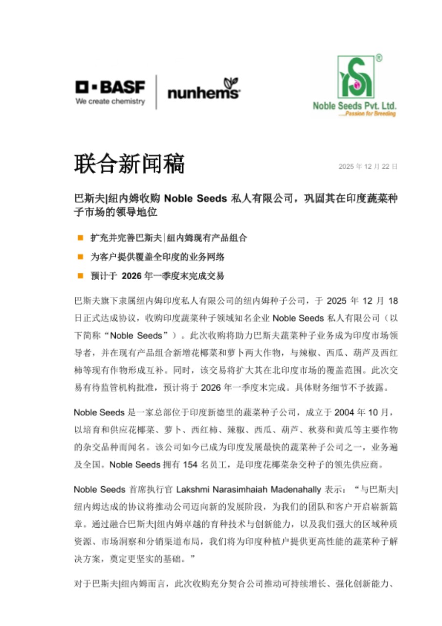 巴斯夫旗下隶属纽内姆印度私人有限公司的纽内姆种子公司,于 2025 年 12 月 18日正式达成协议,收购印度蔬菜种子领域知名企业 Noble Seeds 私人有限公司(以下简称“Noble Seeds”)。此次收购将助力巴斯夫蔬菜种子业务成为印度市场领导者,并在现有产品组合新增花椰菜和萝卜两大作物,与辣椒、西瓜、葫芦及西红柿等现有作物形成互补。同时,该交易将扩大其在北印度市场的覆盖范围。此次交易有待监管机构批准,预计将于 2026 年一季度末完成。具体财务细节不予披露。