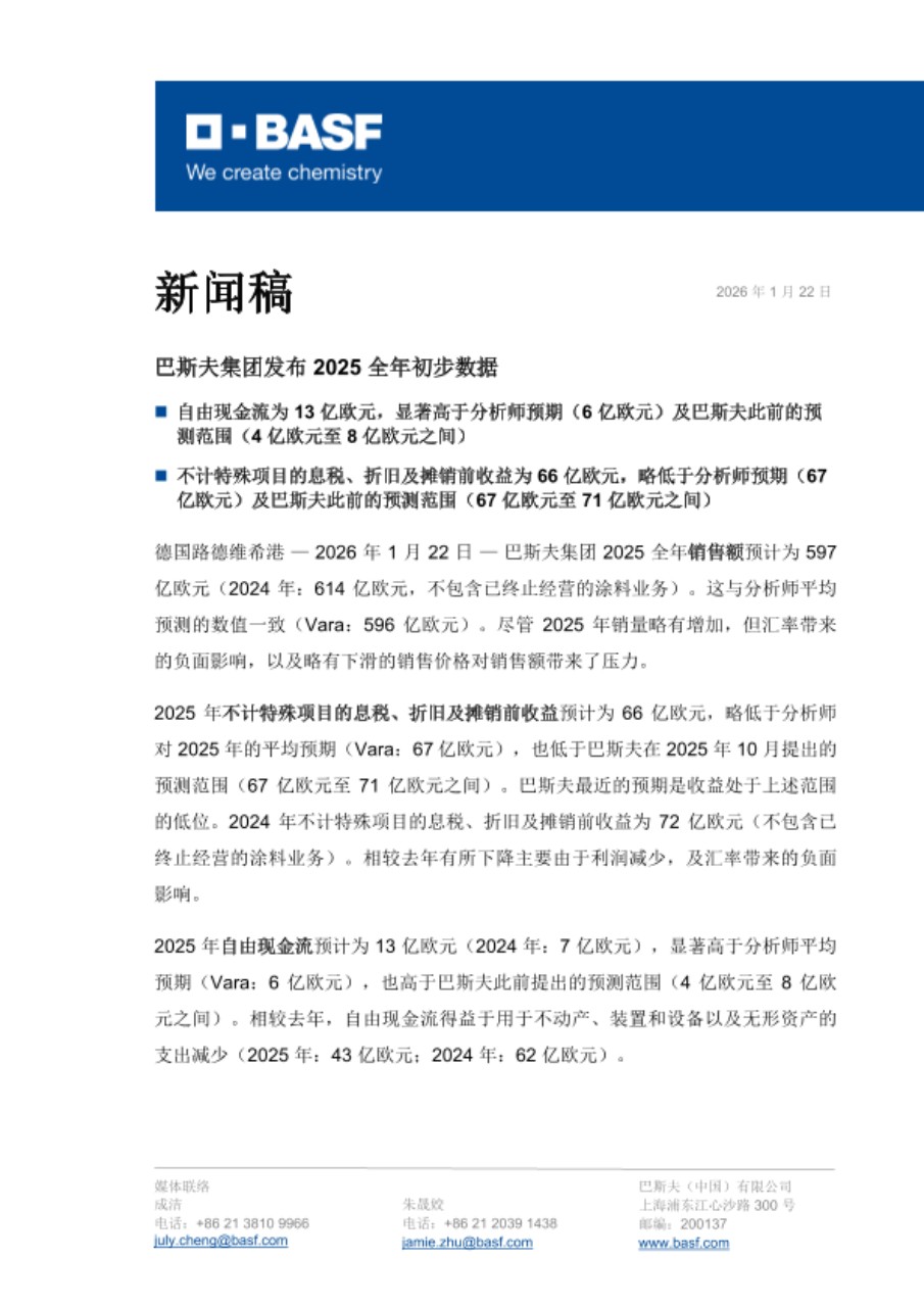 巴斯夫集团 2025 年财务数据将于 2026 年 2 月 27 日发布。分析师和投资者的电话会议定于当天 16:00 至 17:00(北京时间)举行;年度新闻发布会将于 17:30 至 18:30(北京时间)举行。