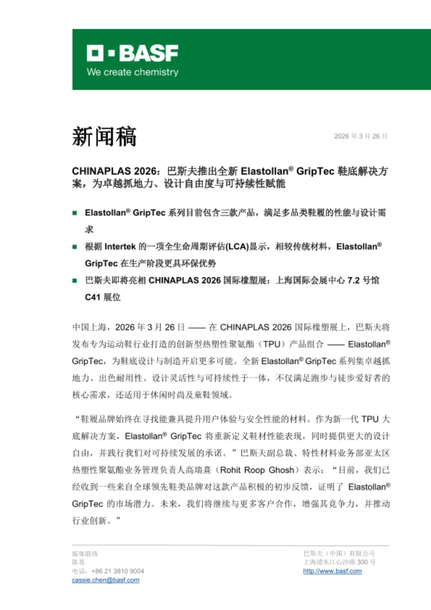 中国上海,2026年3月26日 —— 在 CHINAPLAS 2026 国际橡塑展上,巴斯夫将发布专为运动鞋行业打造的创新型热塑性聚氨酯(TPU)产品组合 —— Elastollan® GripTec,为鞋底设计与制造开启更多可能。全新 Elastollan® GripTec 系列集卓越抓地力、出色耐用性、设计灵活性与可持续性于一体,不仅满足跑步与徒步爱好者的核心需求,还适用于休闲时尚及童鞋领域。