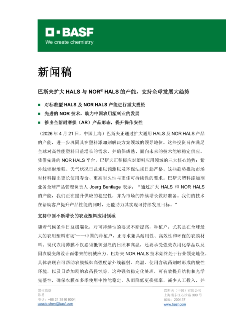(2026 年 4 月 21 日,中国上海)巴斯夫正通过扩大通用 HALS 及 NOR HALS 产品的产能,进一步巩固其在塑料添加剂解决方案领域的领导地位。这些投资旨在满足全球对高性能塑料日益增长的需求,并确保成熟、面向未来的技术能够稳定供应。凭借先进的 NOR HALS 平台,巴斯夫正积极应对塑料应用领域的三大核心趋势:紫外线辐射增强、天气状况日益难以预测以及环保法规日趋严格。这些趋势推动市场对材料提出更长使用寿命、更高耐久性与更佳可持续性的要求。巴斯夫塑料添加剂业务全球产品管理负责人 Joerg Bentlage 表示:“通过扩大 HALS 和 NOR HALS 的产能,我们正在提升供应的稳定性,并为市场的持续增长做好准备。我们的技术在帮助客户提升产品性能的同时,还能助力其实现可持续发展目标。”