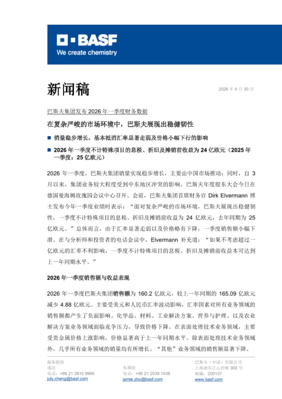 2026年一季度,巴斯夫集团销量实现稳步增长,主要由中国市场推动;同时,自3月以来,集团业务较大程度受到中东地区冲突的影响。巴斯夫年度股东大会今日在德国曼海姆玫瑰园会议中心召开。会前,巴斯夫集团首席财务官 Dirk Elvermann 博士发布今年一季度业绩时表示:“面对复杂严峻的市场环境,巴斯夫展现出稳健韧性,一季度不计特殊项目的息税、折旧及摊销前收益为24亿欧元,去年同期为25亿欧元。”总体而言,由于汇率显著走弱以及价格略有下降,一季度销售额小幅下滑。在与分析师和投资者的电话会议中,Elvermann 补充道:“如果不考虑超过一亿欧元的汇率不利影响,一季度不计特殊项目的息税、折旧及摊销前收益本可达到上一年同期水平。”