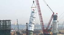 800吨蒸馏塔的运输技术要求极高,引起了中央电视台的关注,进行了90分钟的直播报道。引人注目的还有另一个高92米的蒸馏塔的吊装到位,需要动用特种吊车才能完成该操作。巴(照片:巴斯夫)