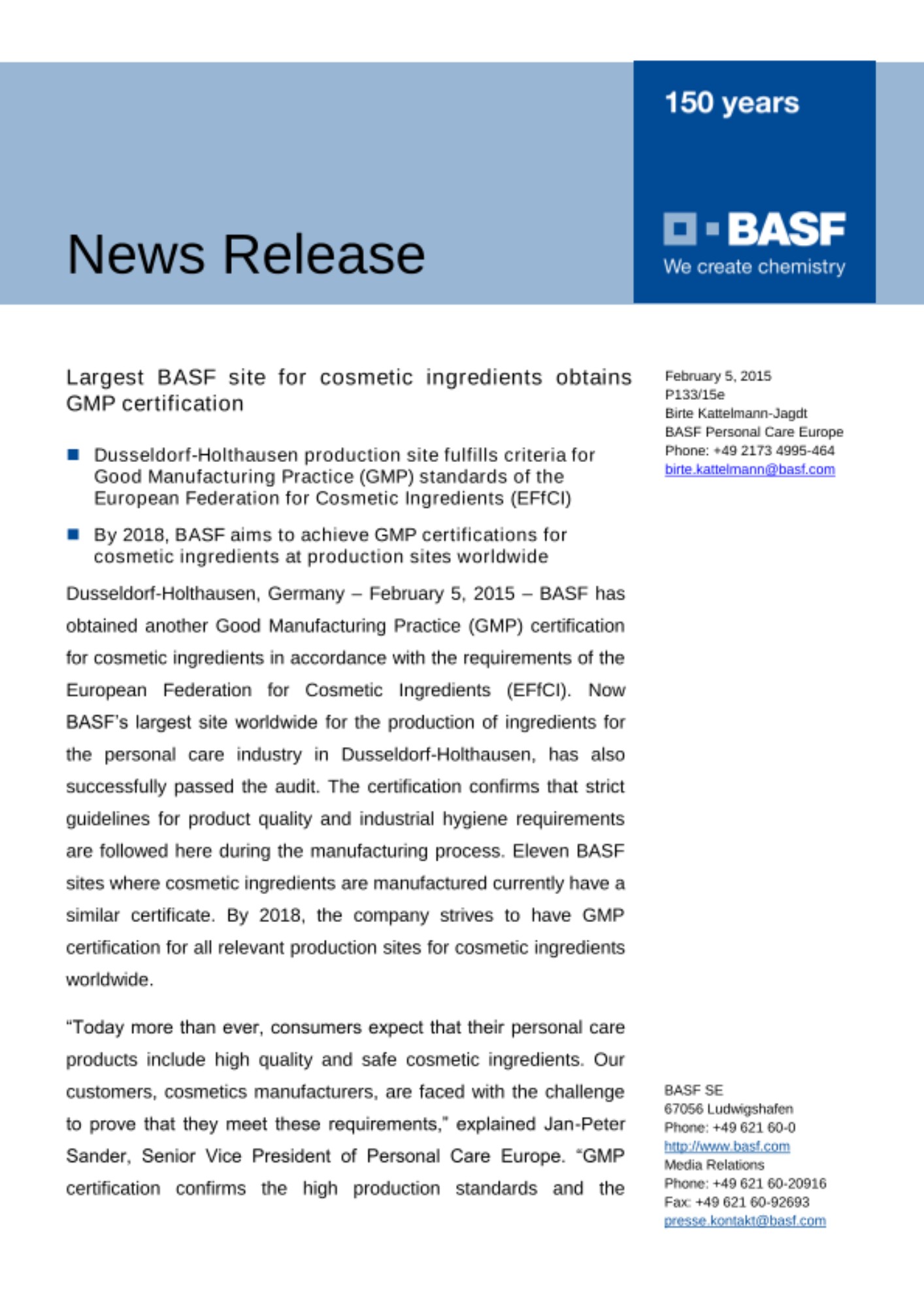 Dusseldorf-Holthausen, Germany – February 5, 2015 – BASF has obtained another Good Manufacturing Practice (GMP) certification for cosmetic ingredients in accordance with the requirements of the European Federation for Cosmetic Ingredients (EFfCI). Now BASF’s largest site worldwide for the production of ingredients for the personal care industry in Dusseldorf-Holthausen, has also successfully passed the audit. The certification confirms that strict guidelines for product quality and industrial hygiene requirements are followed here during the manufacturing process. Eleven BASF sites where cosmetic ingredients are manufactured currently have a similar certificate. By 2018, the company strives to have GMP certification for all relevant production sites for cosmetic ingredients worldwide.