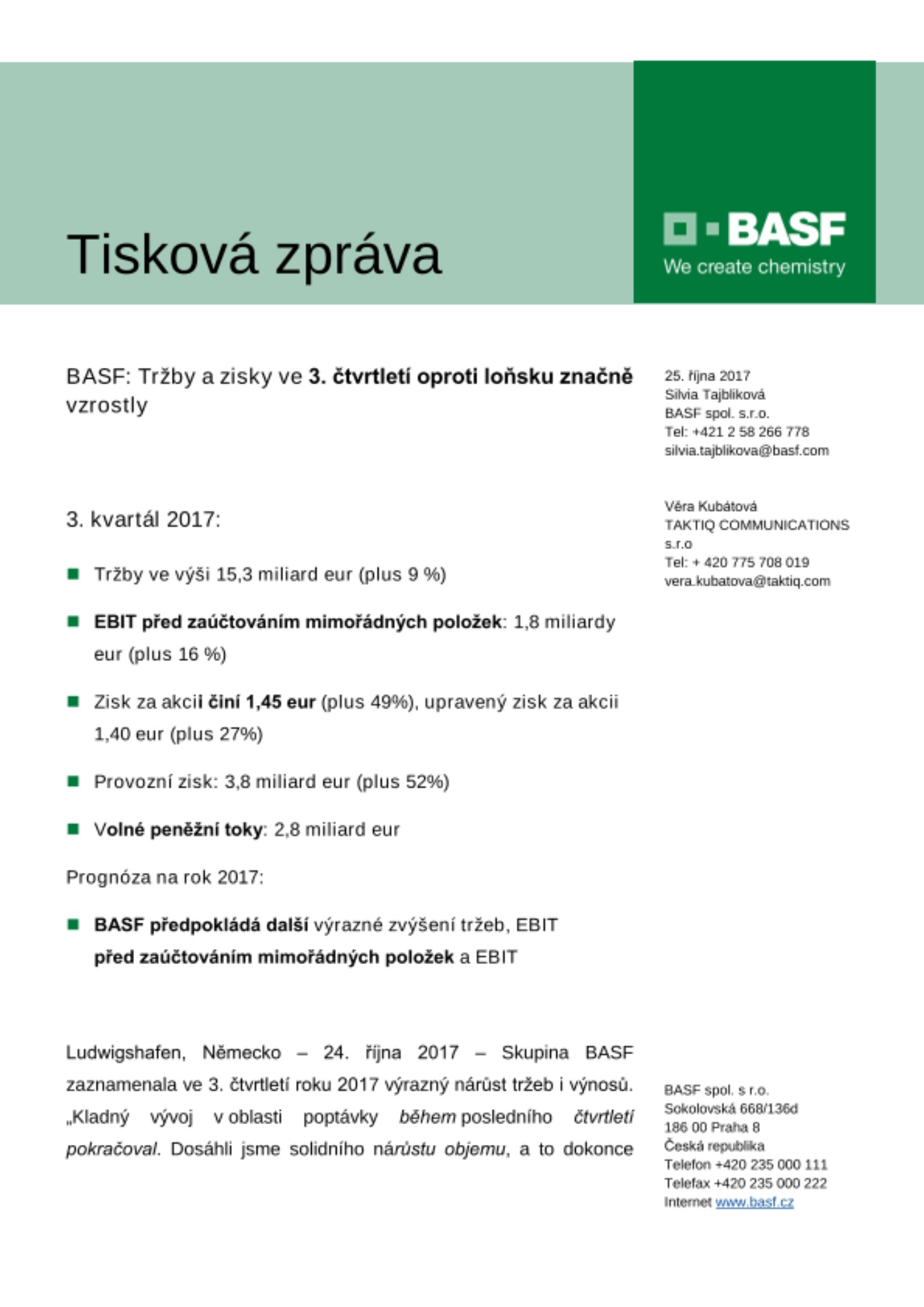 Ludwigshafen, Německo – 25. října 2017 – Skupina BASF zaznamenala ve 3. čtvrtletí roku 2017 výrazný nárůst tržeb i výnosů. „Kladný vývoj v oblasti poptávky během posledního čtvrtletí pokračoval. Dosáhli jsme solidního nárůstu objemu, a to dokonce i ve srovnání se silným 3. kvartálem loňského roku,“ uvedl Dr. Kurt Bock, předseda představenstva společnosti BASF SE.