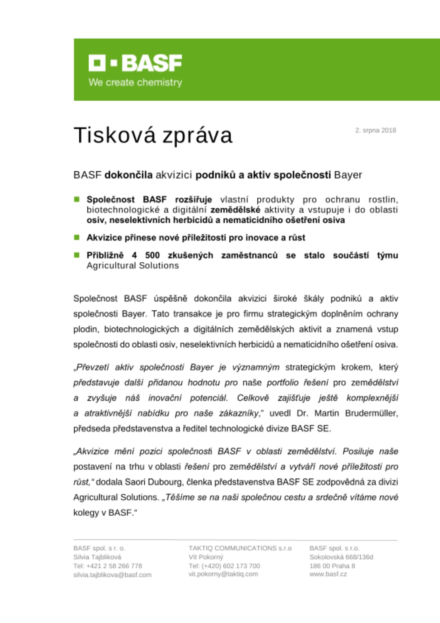 Společnost BASF úspěšně dokončila akvizici široké škály podniků a aktiv společnosti Bayer. Tato transakce je pro firmu strategickým doplněním ochrany plodin, biotechnologických a digitálních zemědělských aktivit a znamená vstup společnosti do oblasti osiv, neselektivních herbicidů a nematicidního ošetření osiva.