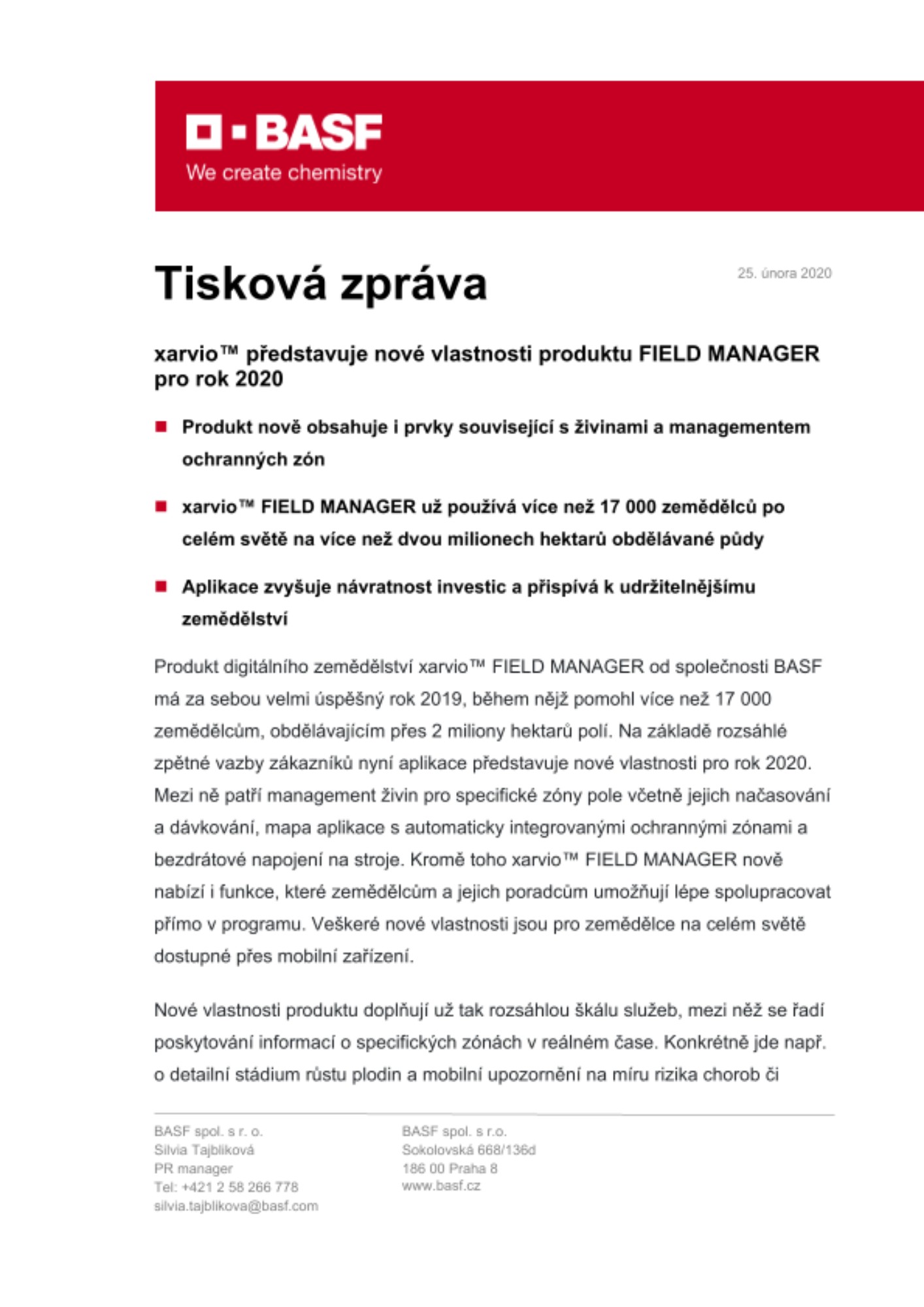 Produkt digitálního zemědělství xarvio™ FIELD MANAGER od společnosti BASF má za sebou velmi úspěšný rok 2019, během nějž pomohl více než 17 000 zemědělcům, obdělávajícím přes 2 miliony hektarů polí. Na základě rozsáhlé zpětné vazby zákazníků nyní aplikace představuje nové vlastnosti pro rok 2020. Mezi ně patří management živin pro specifické zóny pole včetně jejich načasování a dávkování, mapa aplikace s automaticky integrovanými ochrannými zónami a bezdrátové napojení na stroje. Kromě toho xarvio™ FIELD MANAGER nově nabízí i funkce, které zemědělcům a jejich poradcům umožňují lépe spolupracovat přímo v programu. Veškeré nové vlastnosti jsou pro zemědělce na celém světě dostupné přes mobilní zařízení.