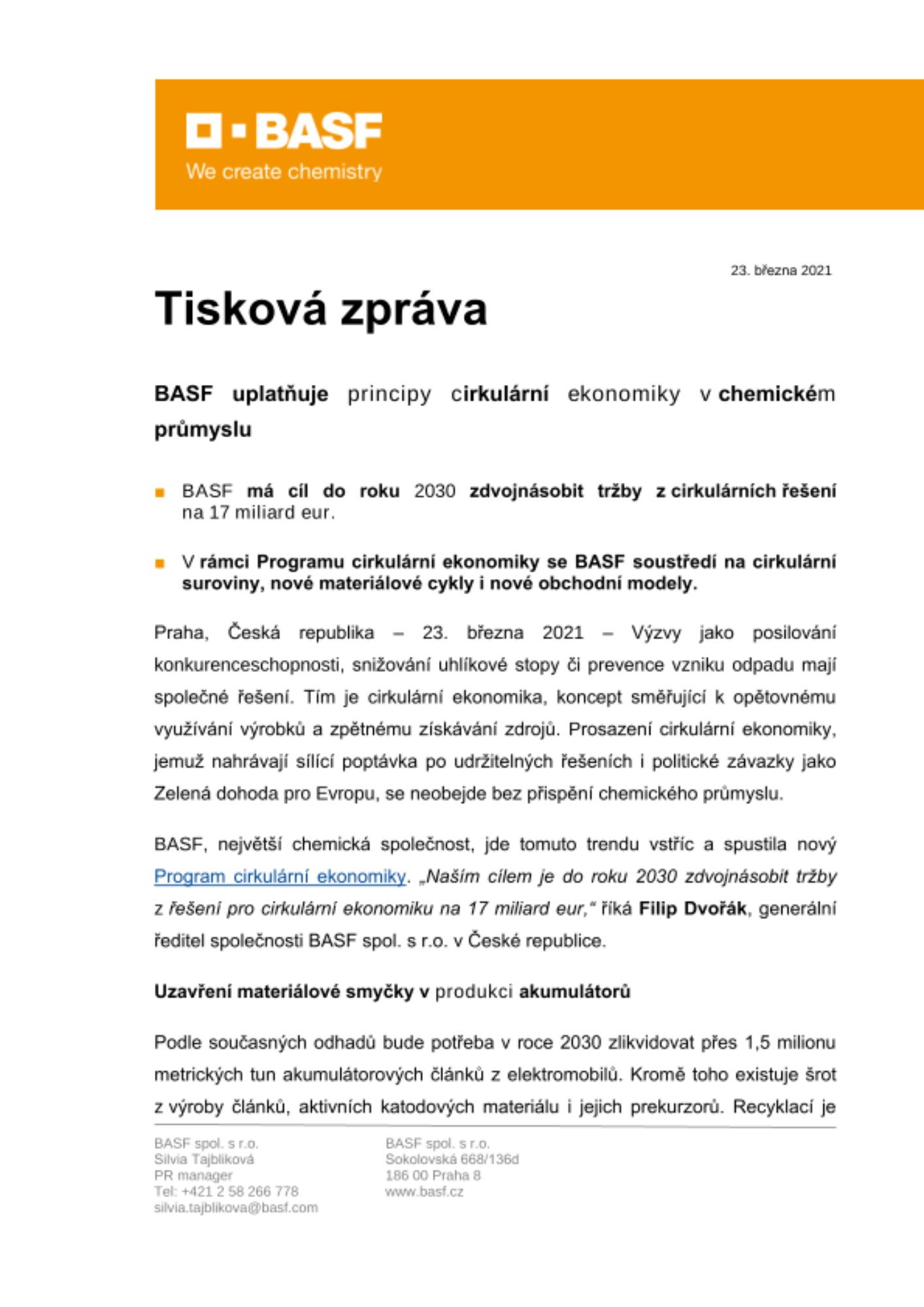 BASF, největší chemická společnost, jde tomuto trendu vstříc a spustila nový Program cirkulární ekonomiky. „Naším cílem je do roku 2030 zdvojnásobit tržby z řešení pro cirkulární ekonomiku na 17 miliard eur,“ říká Filip Dvořák, generální ředitel společnosti BASF spol. s r.o. v České republice.