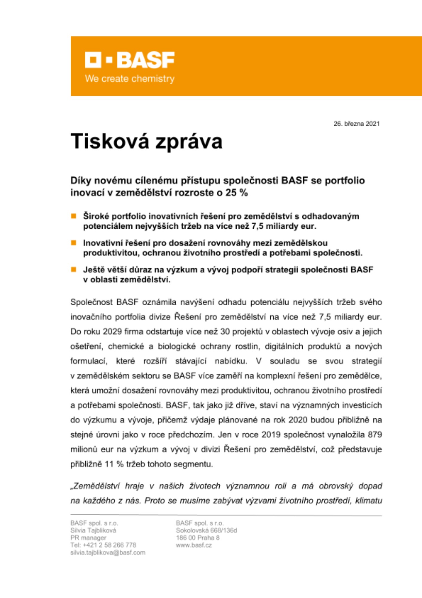 Společnost BASF oznámila navýšení odhadu potenciálu nejvyšších tržeb svého inovačního portfolia divize Řešení pro zemědělství na více než 7,5 miliardy eur. Do roku 2029 firma odstartuje více než 30 projektů v oblastech vývoje osiv a jejich ošetření, chemické a biologické ochrany rostlin, digitálních produktů a nových formulací, které rozšíří stávající nabídku. V souladu se svou strategií v zemědělském sektoru se BASF více zaměří na komplexní řešení pro zemědělce, která umožní dosažení rovnováhy mezi produktivitou, ochranou životního prostředí a potřebami společnosti. BASF, tak jako již dříve, staví na významných investicích do výzkumu a vývoje, přičemž výdaje plánované na rok 2020 budou přibližně na stejné úrovni jako v roce předchozím. Jen v roce 2019 společnost vynaložila 879 milionů eur na výzkum a vývoj v divizi Řešení pro zemědělství, což představuje přibližně 11 % tržeb tohoto segmentu.