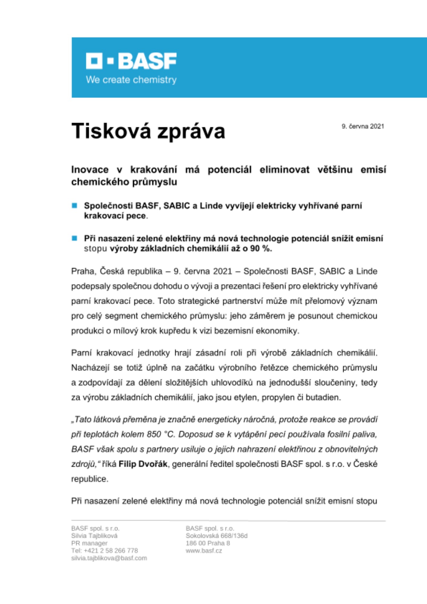 Praha, Česká republika – 9. června 2021 – Společnosti BASF, SABIC a Linde podepsaly společnou dohodu o vývoji a prezentaci řešení pro elektricky vyhřívané parní krakovací pece. Toto strategické partnerství může mít přelomový význam pro celý segment chemického průmyslu: jeho záměrem je posunout chemickou produkci o mílový krok kupředu k vizi bezemisní ekonomiky.