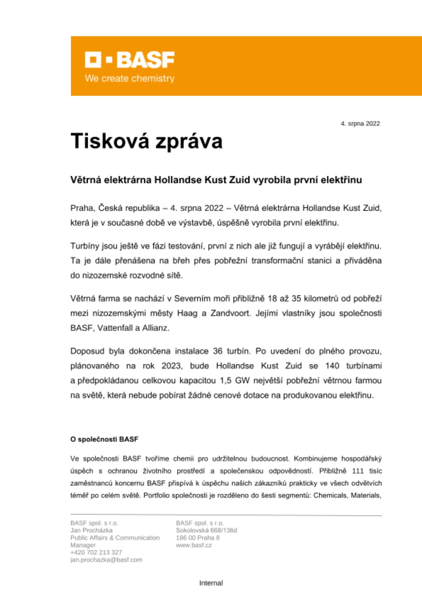 Praha, Česká republika – 4. srpna 2022 – Větrná elektrárna Hollandse Kust Zuid, která je v současné době ve výstavbě, úspěšně vyrobila první elektřinu.