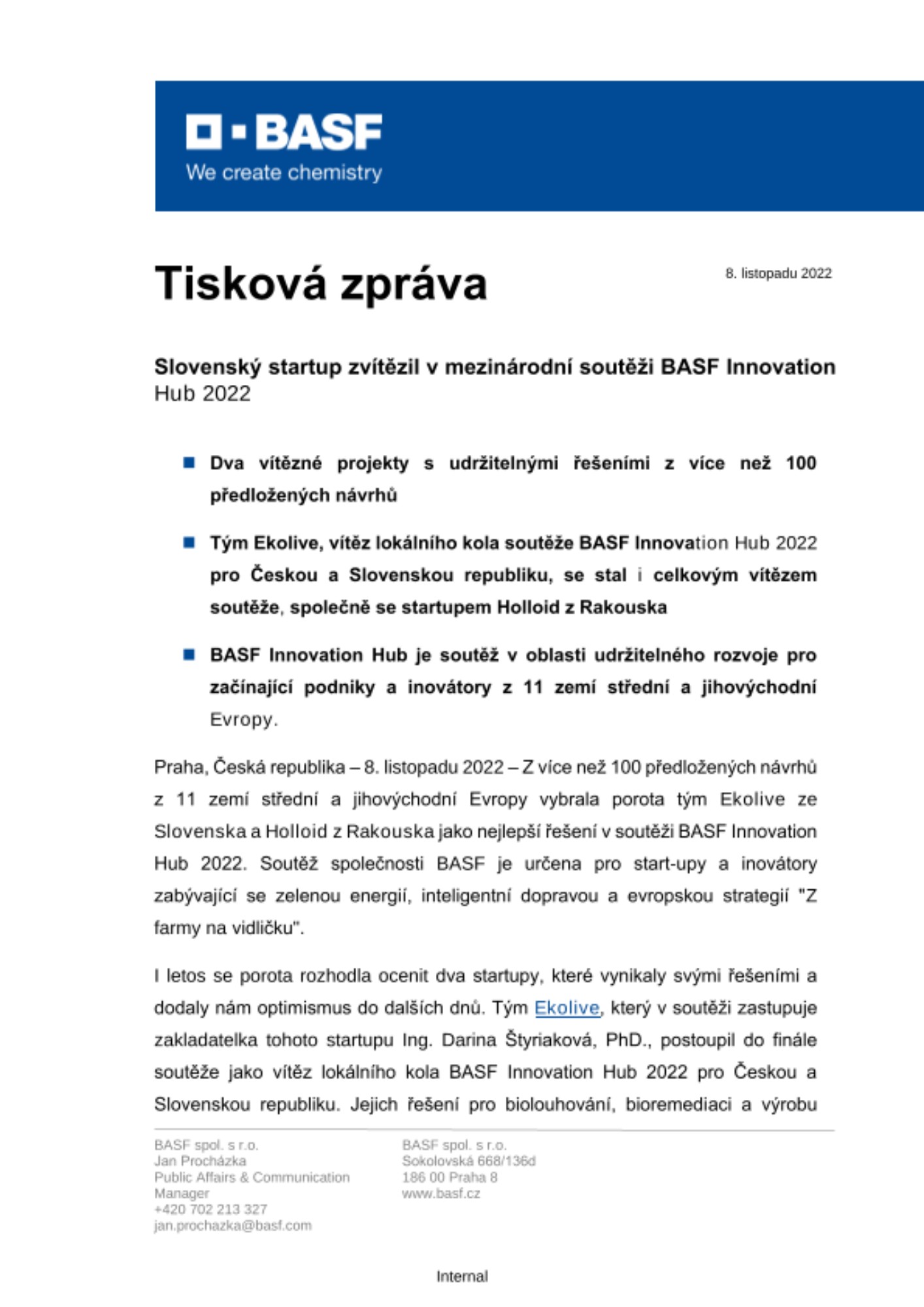 Praha, Česká republika – 8. listopadu 2022 – Z více než 100 předložených návrhů z 11 zemí střední a jihovýchodní Evropy vybrala porota tým Ekolive ze Slovenska a Holloid z Rakouska jako nejlepší řešení v soutěži BASF Innovation Hub 2022. Soutěž společnosti BASF je určena pro start-upy a inovátory zabývající se zelenou energií, inteligentní dopravou a evropskou strategií "Z farmy na vidličku".