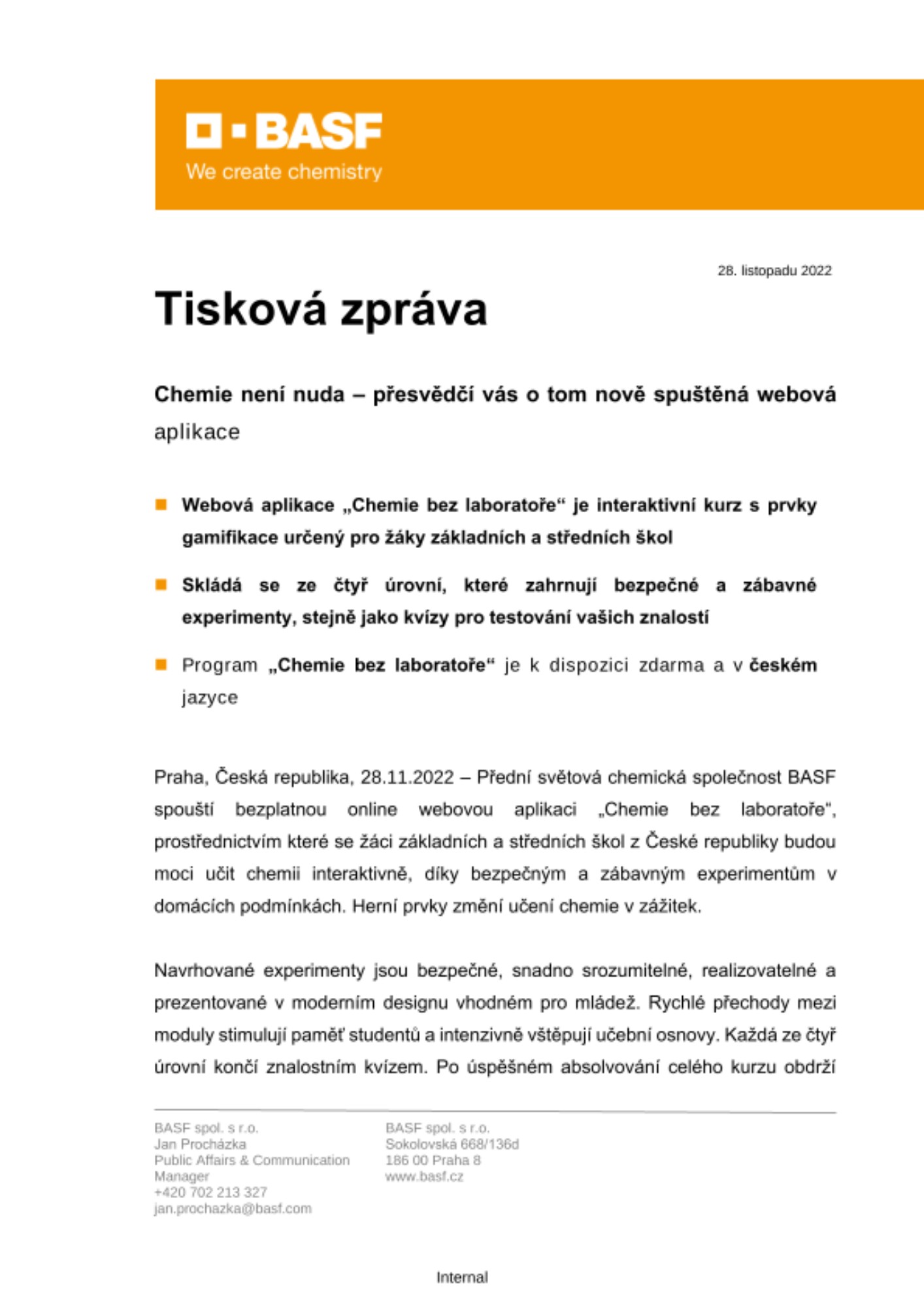 Praha, Česká republika, 28.11.2022 – Přední světová chemická společnost BASF spouští bezplatnou online webovou aplikaci „Chemie bez laboratoře“, prostřednictvím které se žáci základních a středních škol z České republiky budou moci učit chemii interaktivně, díky bezpečným a zábavným experimentům v domácích podmínkách. Herní prvky změní učení chemie v zážitek.