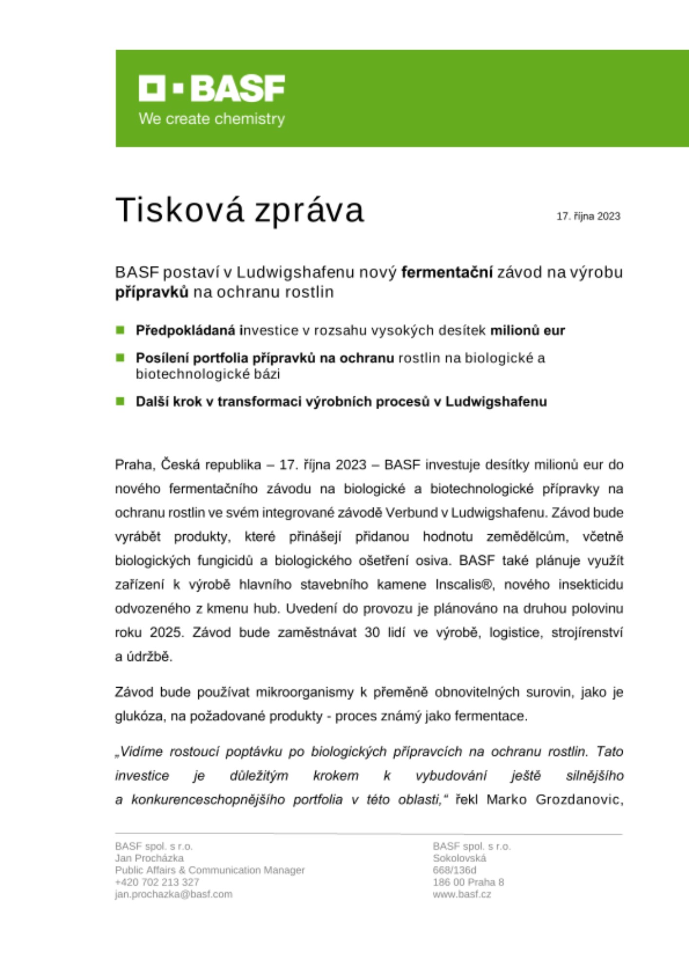 Praha, Česká republika – 17. října 2023 – BASF investuje desítky milionů eur do nového fermentačního závodu na biologické a biotechnologické přípravky na ochranu rostlin ve svém integrované závodě Verbund v Ludwigshafenu. Závod bude vyrábět produkty, které přinášejí přidanou hodnotu zemědělcům, včetně biologických fungicidů a biologického ošetření osiva. BASF také plánuje využít zařízení k výrobě hlavního stavebního kamene Inscalis®, nového insekticidu odvozeného z kmenu hub. Uvedení do provozu je plánováno na druhou polovinu roku 2025. Závod bude zaměstnávat 30 lidí ve výrobě, logistice, strojírenství a údržbě.