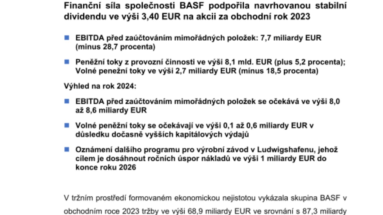 Skupina BASF: Výsledky za obchodní rok 2023. Finanční síla společnosti BASF podpořila navrhovanou stabilní dividendu ve výši 3,40 EUR na akcii za obchodní rok 2023
