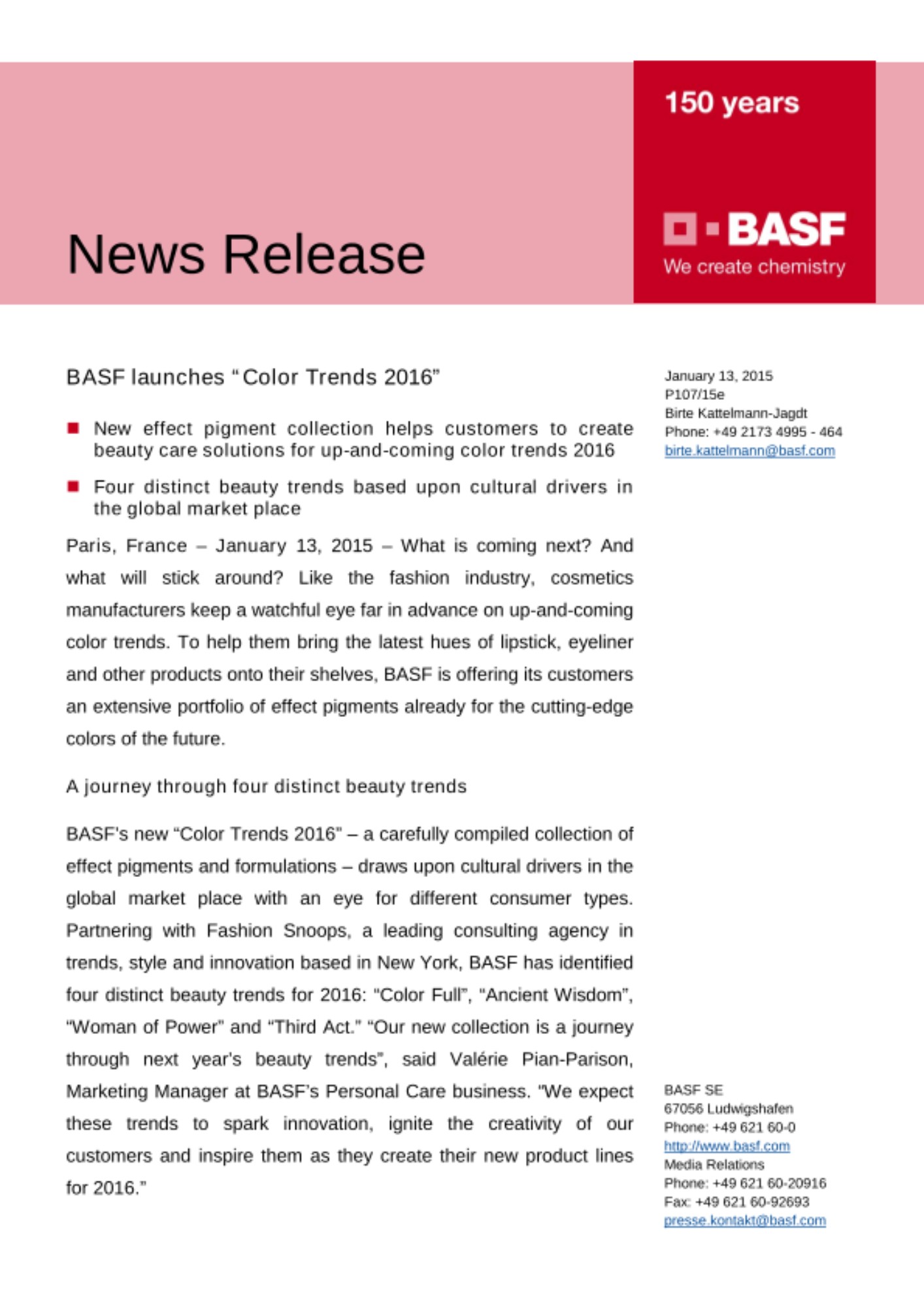 - New effect pigment collection helps customers to create beauty care solutions for up-and-coming color trends 2016