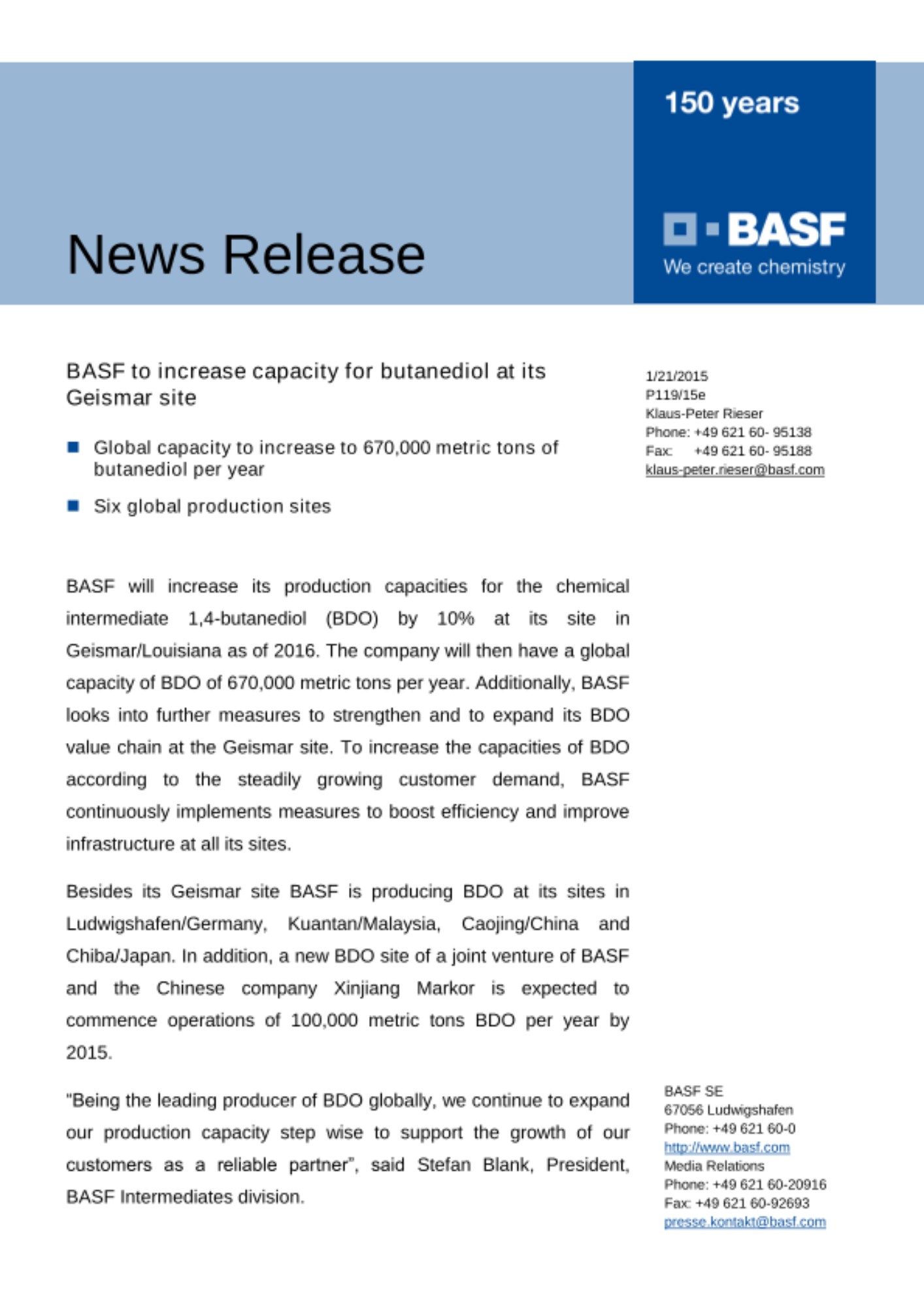 Besides its Geismar site BASF is producing BDO at its sites in Ludwigshafen/Germany, Kuantan/Malaysia, Caojing/China and Chiba/Japan. In addition, a new BDO site of a joint venture of BASF and the Chinese company Xinjiang Markor is expected to commence operations of 100,000 metric tons BDO per year by 2015.