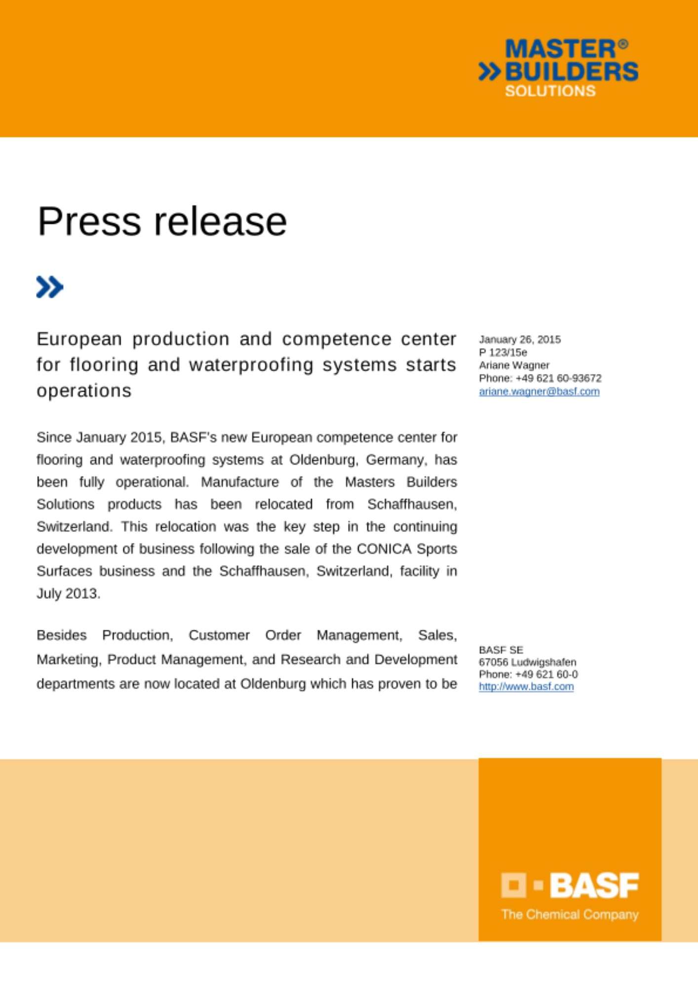 Since January 2015, BASF’s new European competence center for flooring and waterproofing systems at Oldenburg, Germany, has been fully operational. Manufacture of the Masters Builders Solutions products has been relocated from Schaffhausen, Switzerland. This relocation was the key step in the continuing development of business following the sale of the CONICA Sports Surfaces business and the Schaffhausen, Switzerland, facility in July 2013.
