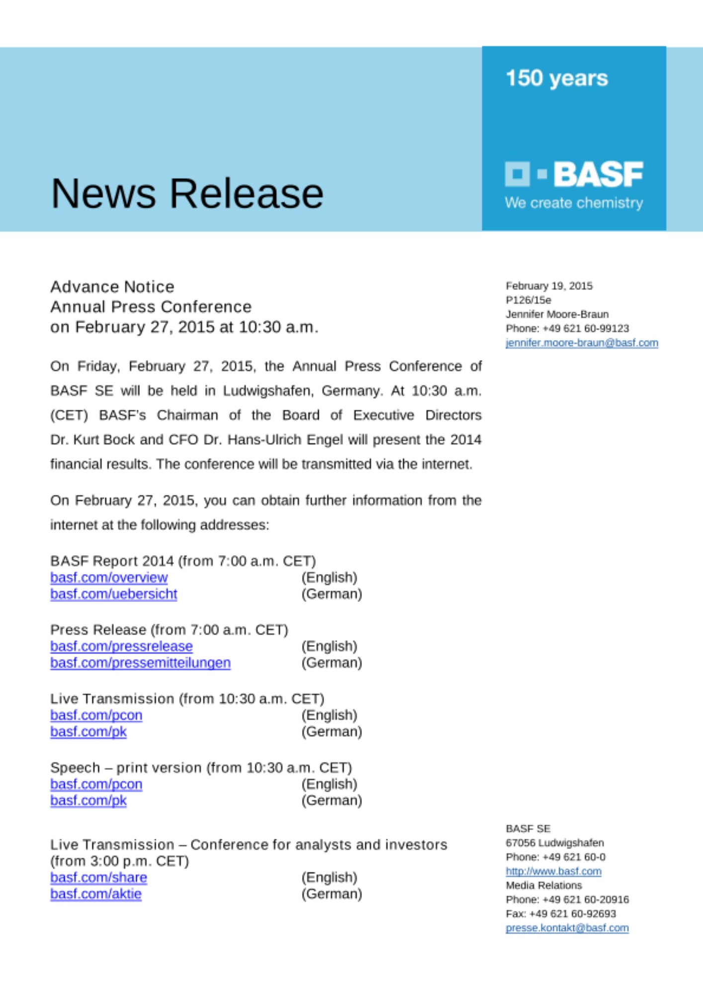 On Friday, February 27, 2015, the Annual Press Conference of BASF SE will be held in Ludwigshafen, Germany. At 10:30 a.m. (CET) BASF’s Chairman of the Board of Executive Directors Dr. Kurt Bock and CFO Dr. Hans-Ulrich Engel will present the 2014 financial results. The conference will be transmitted via the internet.