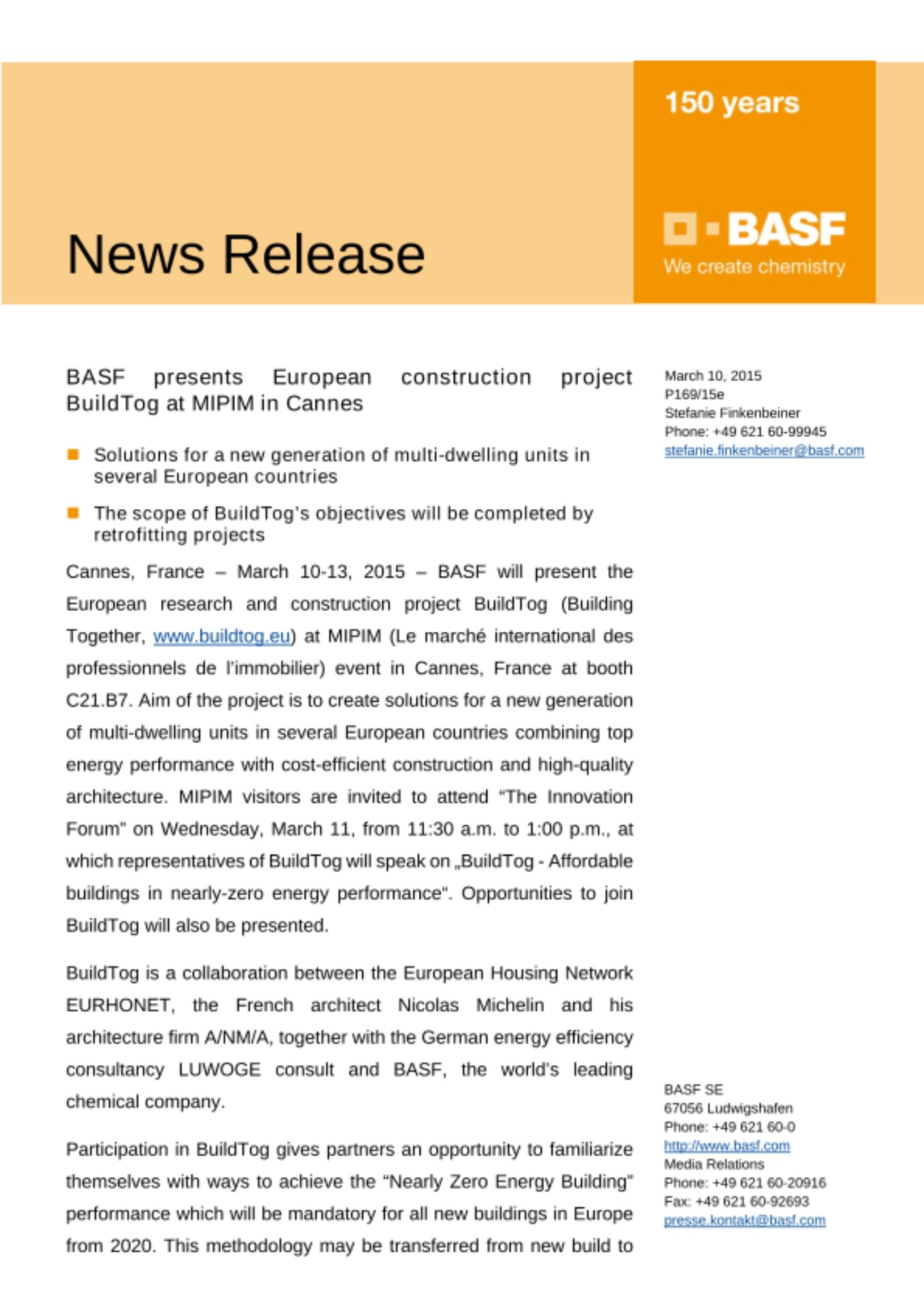 Cannes, France – March 10-13, 2015 – BASF will present the European research and construction project BuildTog (Building Together, www.buildtog.eu) at MIPIM (Le marché international des professionnels de l’immobilier) event in Cannes, France at booth C21.B7. Aim of the project is to create solutions for a new generation of multi-dwelling units in several European countries combining top energy performance with cost-efficient construction and high-quality architecture. MIPIM visitors are invited to attend “The Innovation Forum” on Wednesday, March 11, from 11:30 a.m. to 1:00 p.m., at which representatives of BuildTog will speak on „BuildTog - Affordable buildings in nearly-zero energy performance“. Opportunities to join BuildTog will also be presented.