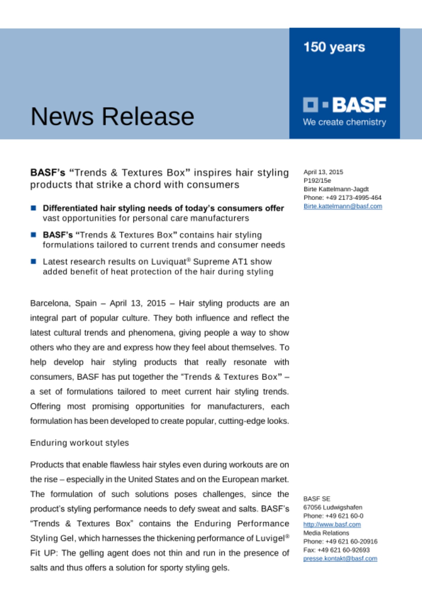 - BASF’s “Trends & Textures Box” contains hair styling formulations tailored to current trends and consumer needs