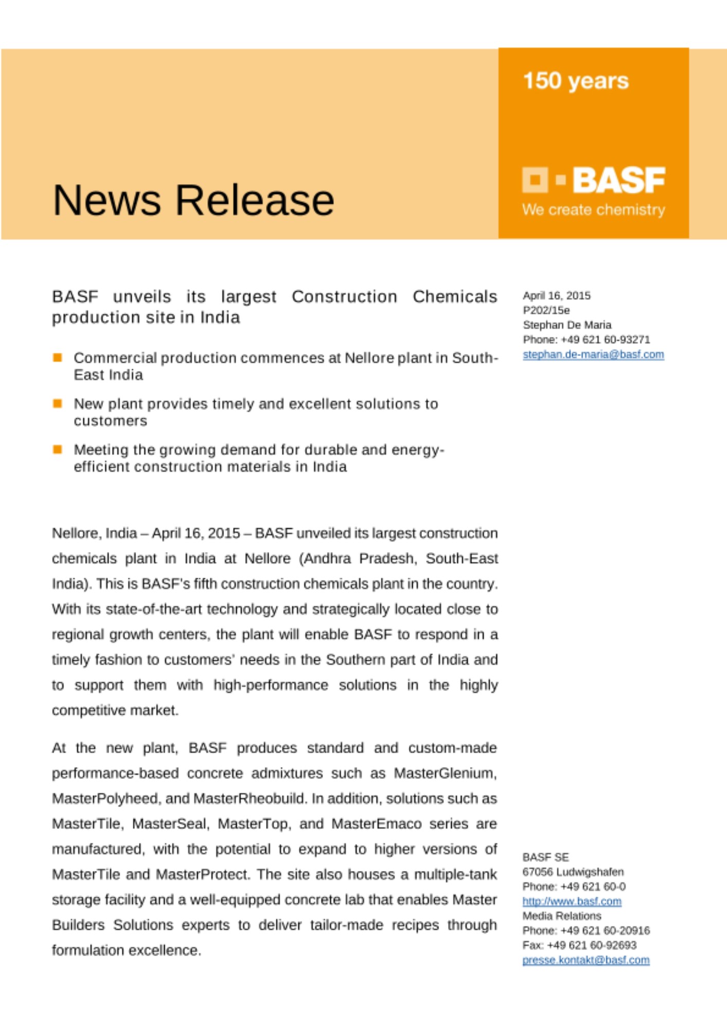“With the new plant at Nellore, BASF offers a comprehensive range of solutions to help construct buildings that can be more energy-efficient, durable, and require fewer resources for maintenance,” said Mr. Ralf Spettmann, President, Construction Chemicals, BASF.