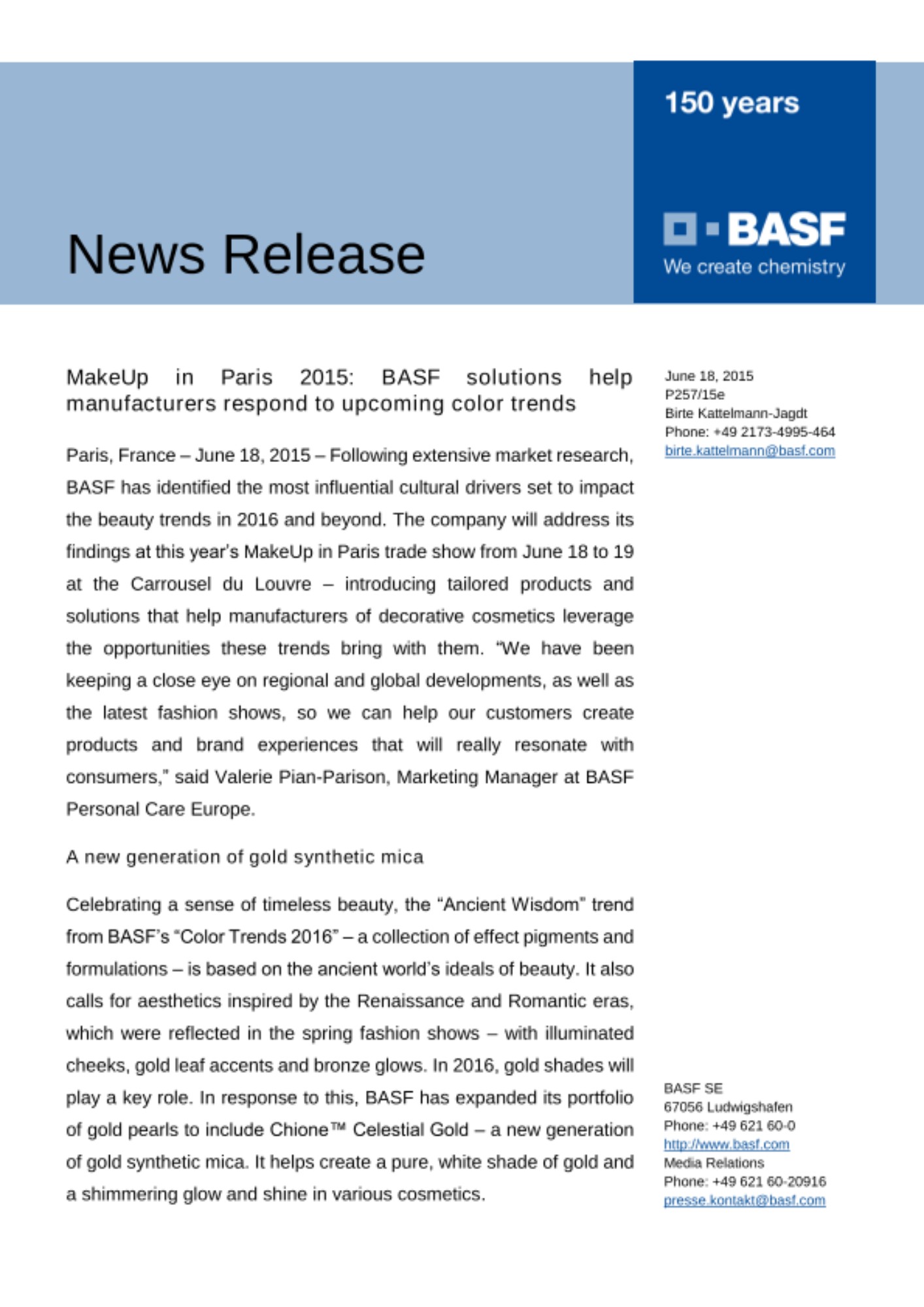 Paris, France – June 18, 2015 – Following extensive market research, BASF has identified the most influential cultural drivers set to impact the beauty trends in 2016 and beyond. The company will address its findings at this year’s MakeUp in Paris trade show from June 18 to 19 at the Carrousel du Louvre – introducing tailored products and solutions that help manufacturers of decorative cosmetics leverage the opportunities these trends bring with them. “We have been keeping a close eye on regional and global developments, as well as the latest fashion shows, so we can help our customers create products and brand experiences that will really resonate with consumers,” said Valerie Pian-Parison, Marketing Manager at BASF Personal Care Europe.