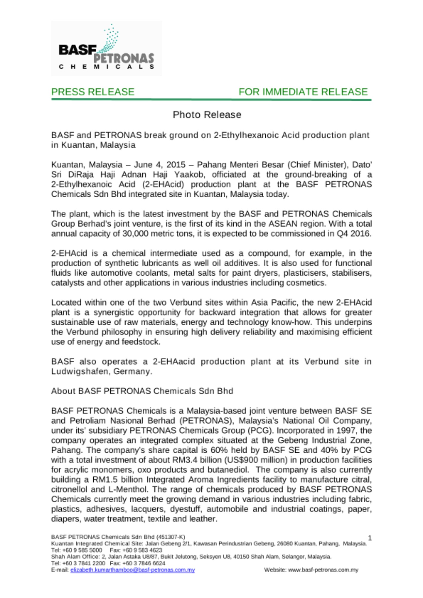Kuantan, Malaysia – June 4, 2015 – Pahang Menteri Besar (Chief Minister), Dato’ Sri DiRaja Haji Adnan Haji Yaakob, officiated at the ground-breaking of a Ethylhexanoic Acid (2-EHAcid) production plant at the BASF PETRONAS Chemicals Sdn Bhd integrated site in Kuantan, Malaysia today.