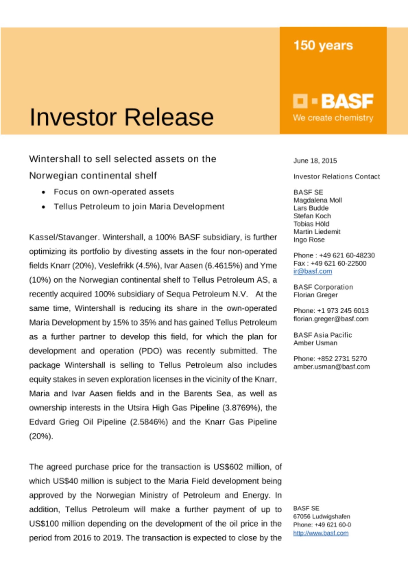 Kassel/Stavanger. Wintershall, a 100% BASF subsidiary, is further optimizing its portfolio by divesting assets in the four non-operated fields Knarr (20%), Veslefrikk (4.5%), Ivar Aasen (6.4615%) and Yme (10%) on the Norwegian continental shelf to Tellus Petroleum AS, a recently acquired 100% subsidiary of Sequa Petroleum N.V. At the same time, Wintershall is reducing its share in the own-operated Maria Development by 15% to 35% and has gained Tellus Petroleum as a further partner to develop this field, for which the plan for development and operation (PDO) was recently submitted. The package Wintershall is selling to Tellus Petroleum also includes equity stakes in seven exploration licenses in the vicinity of the Knarr, Maria and Ivar Aasen fields and in the Barents Sea, as well as ownership interests in the Utsira High Gas Pipeline (3.8769%), the Edvard Grieg Oil Pipeline (2.5846%) and the Knarr Gas Pipeline (20%).