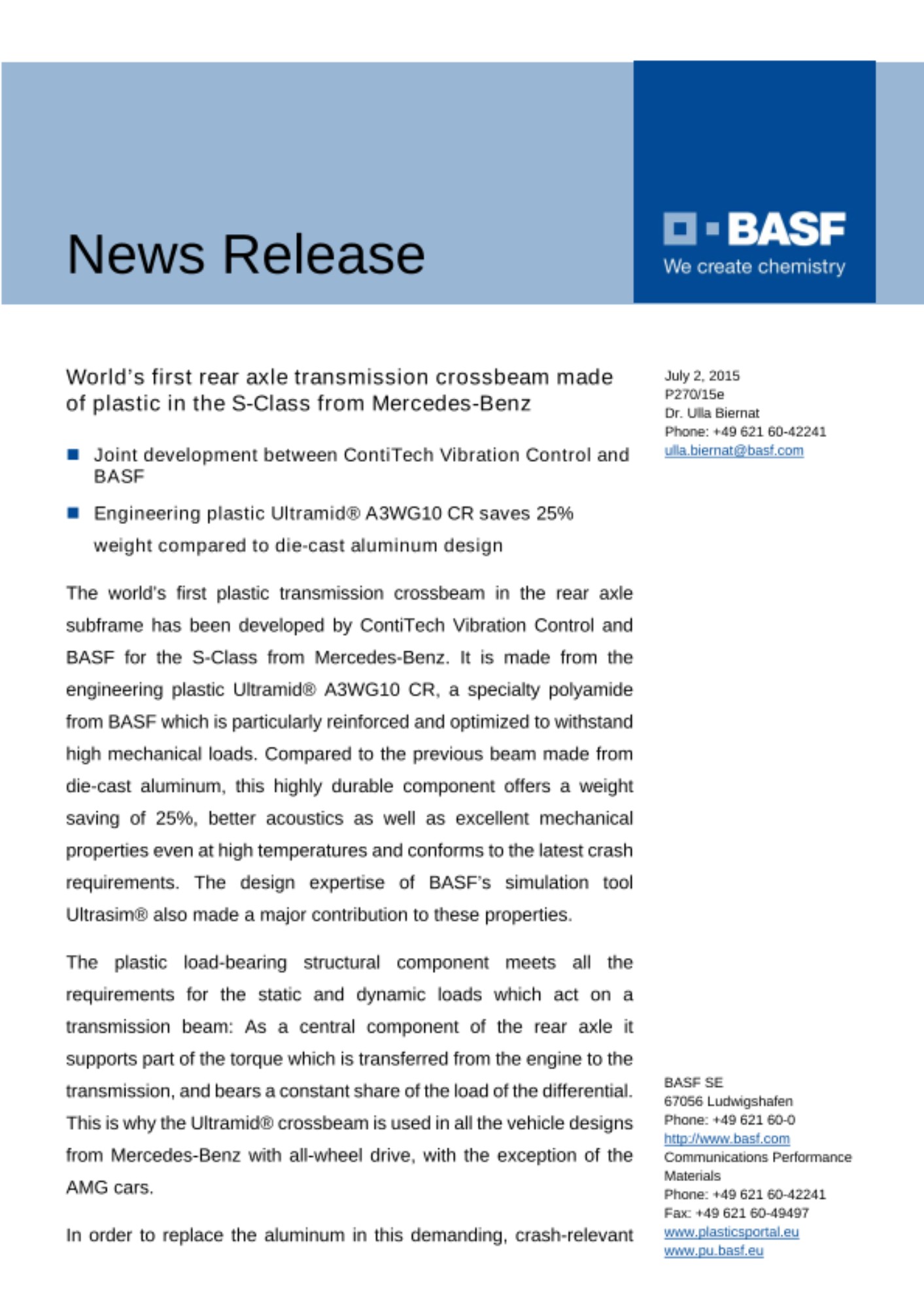 The world’s first plastic transmission crossbeam in the rear axle subframe has been developed by ContiTech Vibration Control and BASF for the S-Class from Mercedes-Benz. It is made from the engineering plastic Ultramid® A3WG10 CR, a specialty polyamide from BASF which is particularly reinforced and optimized to withstand high mechanical loads. Compared to the previous beam made from die-cast aluminum, this highly durable component offers a weight saving of 25%, better acoustics as well as excellent mechanical properties even at high temperatures and conforms to the latest crash requirements. The design expertise of BASF’s simulation tool Ultrasim® also made a major contribution to these properties.