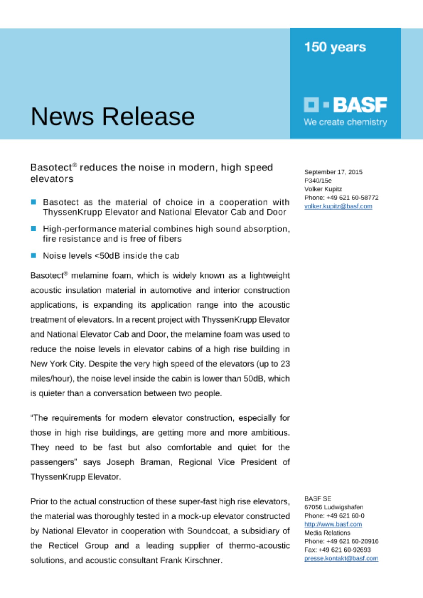 - Basotect as the material of choice in a cooperation with ThyssenKrupp Elevator and National Elevator Cab and Door