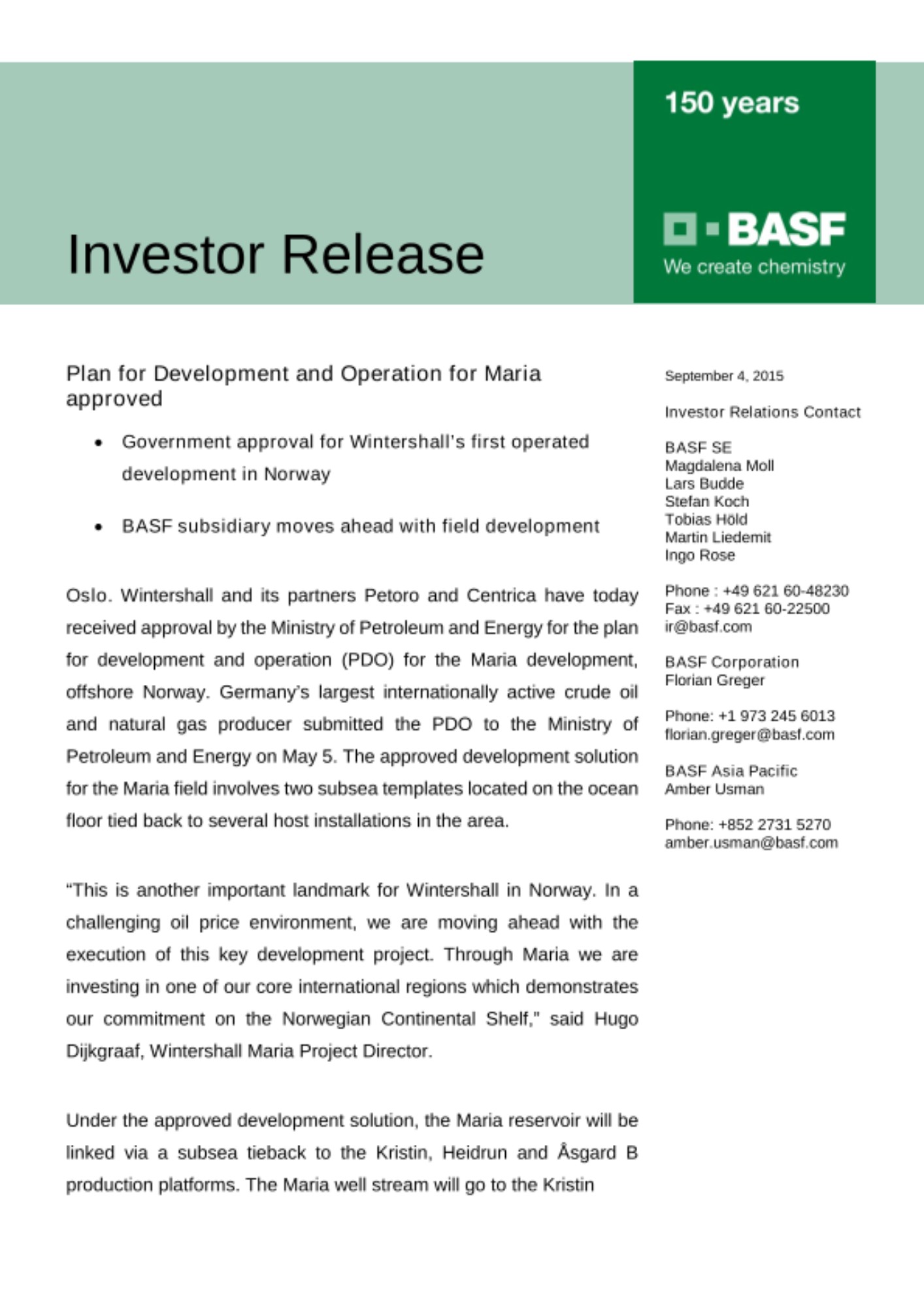 “This is another important landmark for Wintershall in Norway. In a challenging oil price environment, we are moving ahead with the execution of this key development project. Through Maria we are investing in one of our core international regions which demonstrates our commitment on the Norwegian Continental Shelf,” said Hugo Dijkgraaf, Wintershall Maria Project Director.