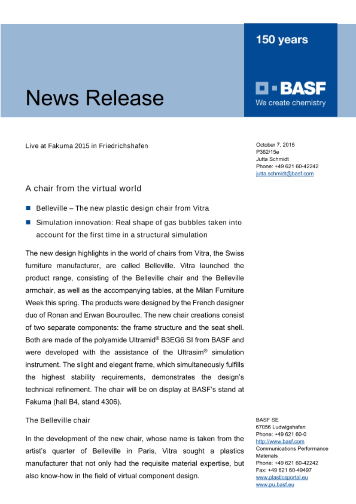“This comprehensive package of product and services was the decisive factor in choosing BASF as our partner in carrying out this project,” said Thomas Schneider, Project Manager Innovation Team Seating, Vitra AG.