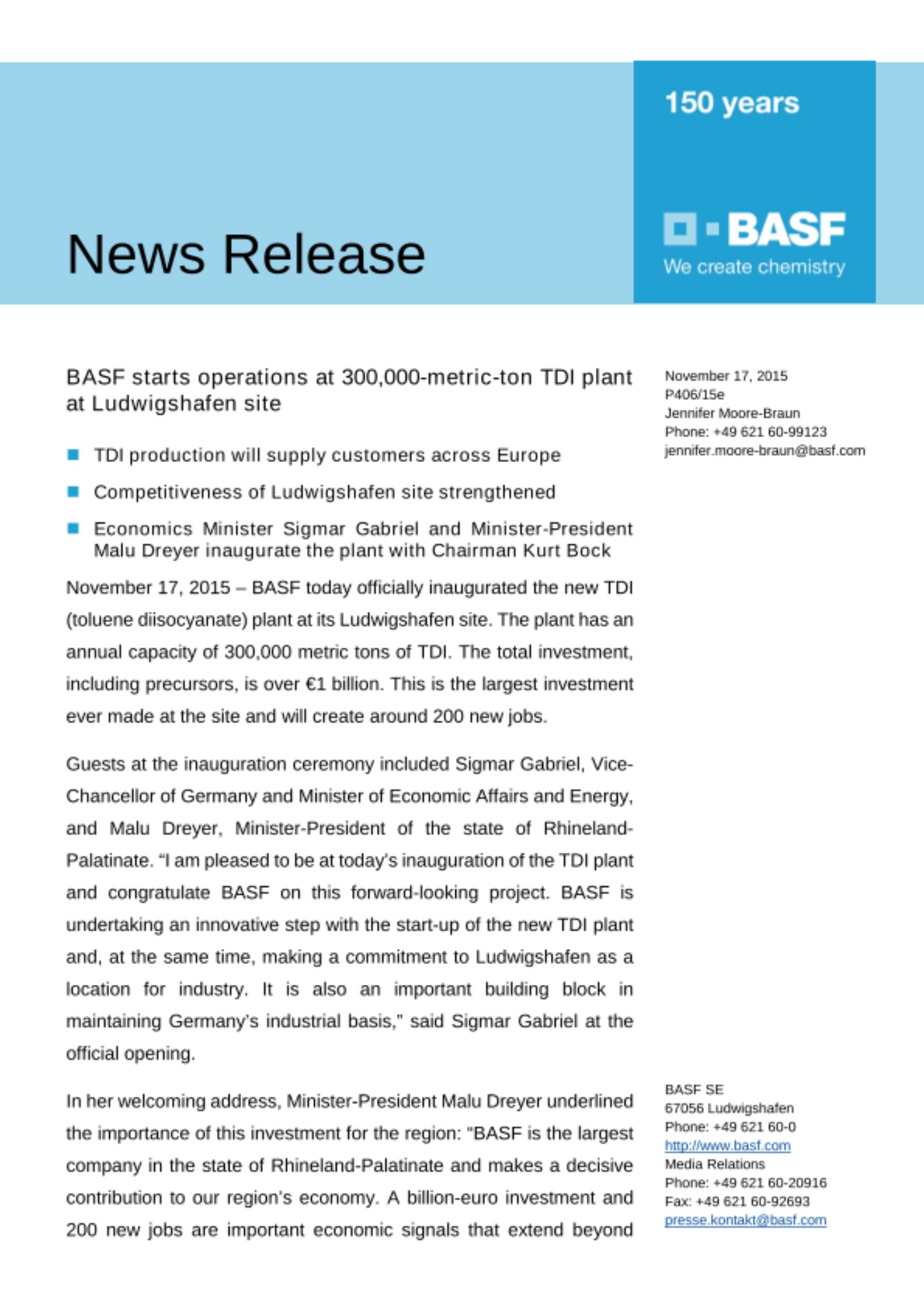 Guests at the inauguration ceremony included Sigmar Gabriel, Vice-Chancellor of Germany and Minister of Economic Affairs and Energy, and Malu Dreyer, Minister-President of the state of Rhineland-Palatinate. “I am pleased to be at today’s inauguration of the TDI plant and congratulate BASF on this forward-looking project. BASF is undertaking an innovative step with the start-up of the new TDI plant and, at the same time, making a commitment to Ludwigshafen as a location for industry. It is also an important building block in maintaining Germany’s industrial basis,” said Sigmar Gabriel at the official opening.