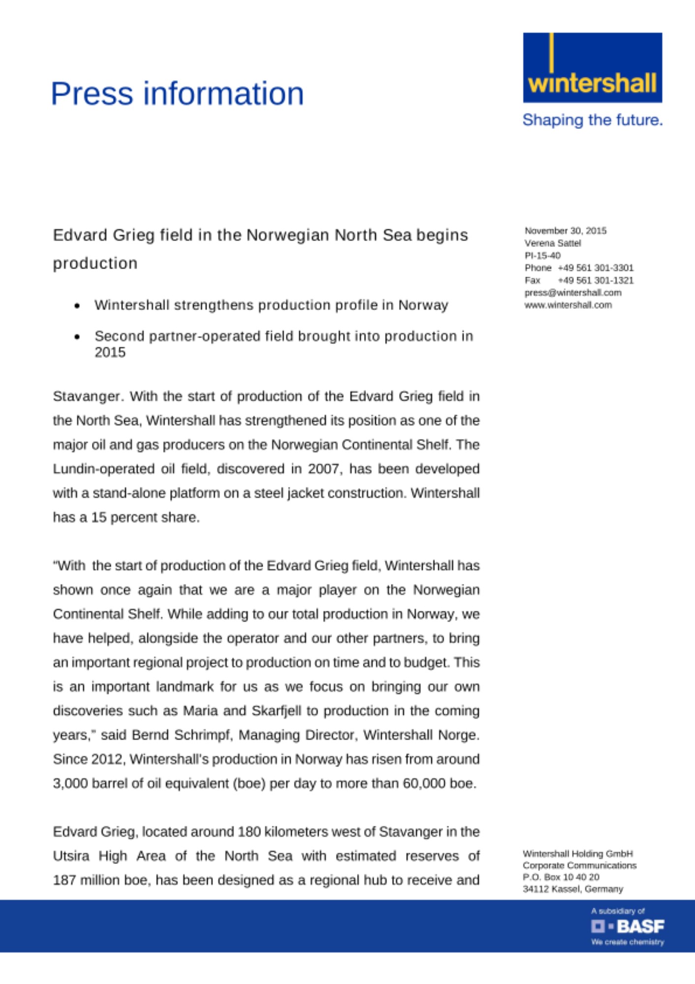 Stavanger. With the start of production of the Edvard Grieg field in the North Sea, Wintershall has strengthened its position as one of the major oil and gas producers on the Norwegian Continental Shelf. The Lundin-operated oil field, discovered in 2007, has been developed with a stand-alone platform on a steel jacket construction. Wintershall has a 15 percent share.