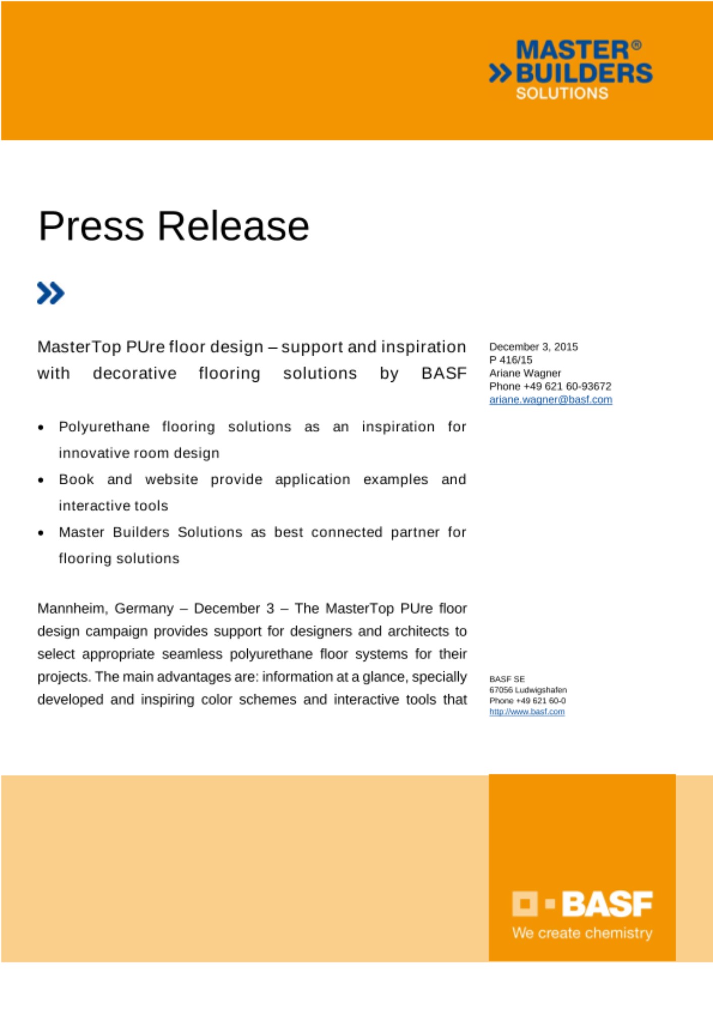 Further support for customers is given by the website www.purefloor.master-builders-solutions.basf.com. It provides additional information about flooring solutions, focusses also on sustainability aspects of MasterTop floors and gives interested individuals the possibility to contact Master Builders Solutions experts easily. Moreover it presents the PUre floor selector – a tool designed to help find the most suitable MasterTop flooring solution for individual requirements.