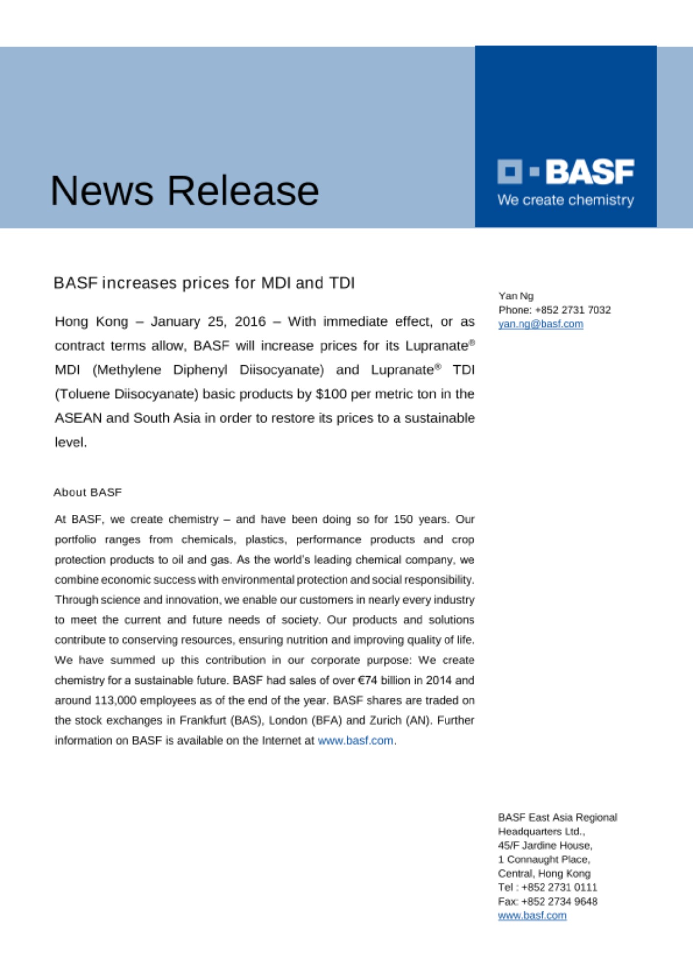 Hong Kong – January 25, 2016 – With immediate effect, or as contract terms allow, BASF will increase prices for its Lupranate® MDI (Methylene Diphenyl Diisocyanate) and Lupranate® TDI (Toluene Diisocyanate) basic products by $100 per metric ton in the ASEAN and South Asia in order to restore its prices to a sustainable level.