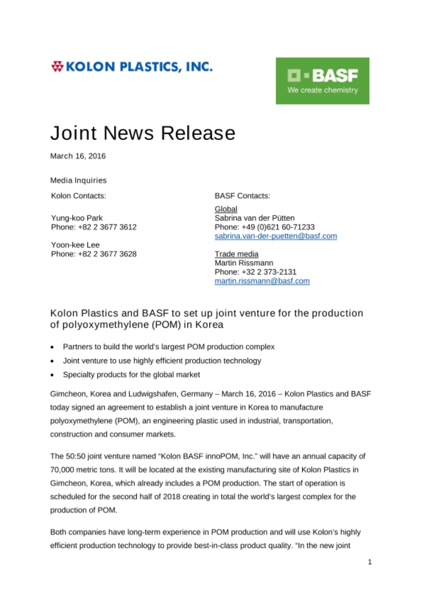 Gimcheon, Korea and Ludwigshafen, Germany – March 16, 2016 – Kolon Plastics and BASF today signed an agreement to establish a joint venture in Korea to manufacture polyoxymethylene (POM), an engineering plastic used in industrial, transportation, construction and consumer markets.