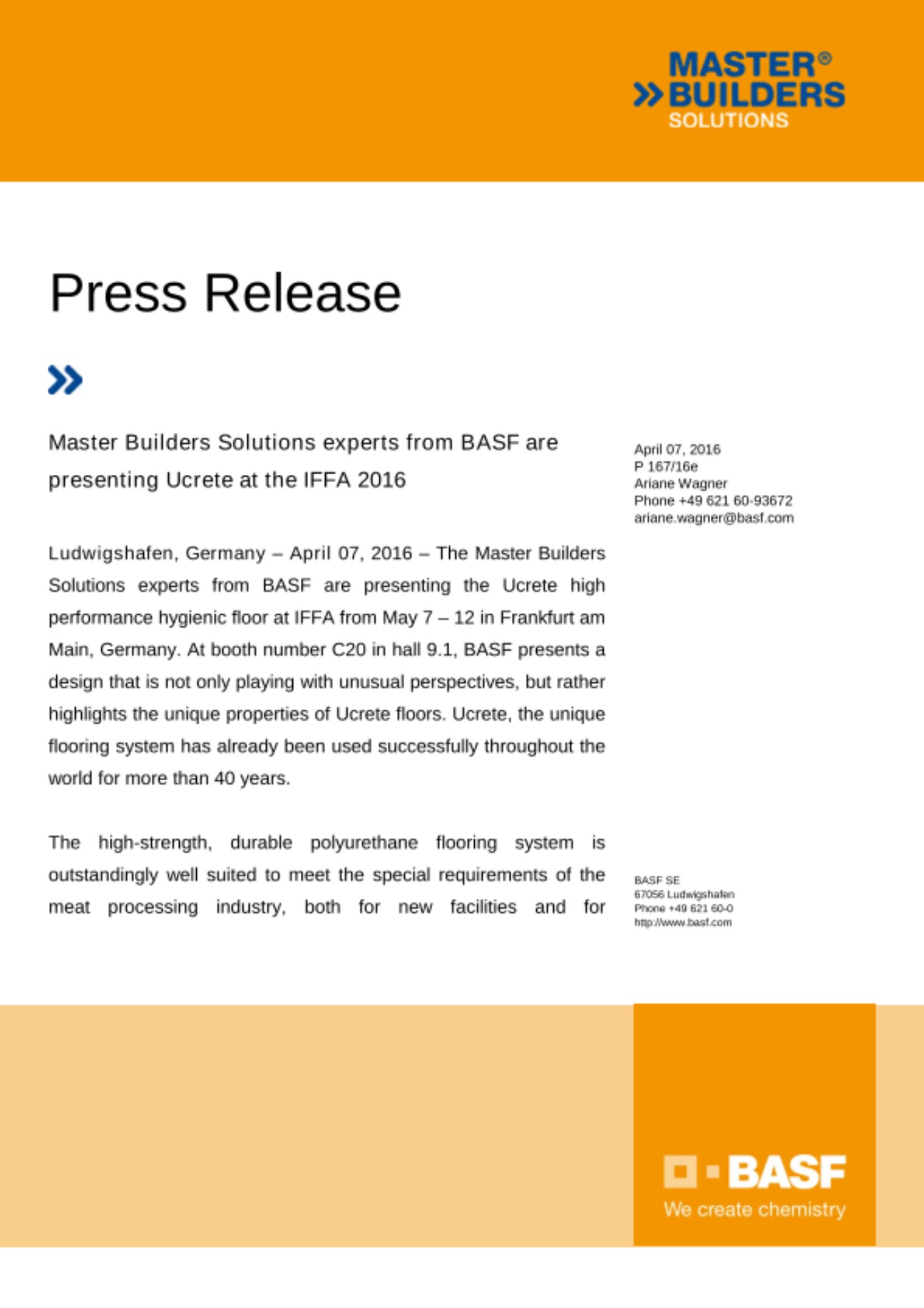 Ludwigshafen, Germany – April 07, 2016 – The Master Builders Solutions experts from BASF are presenting the Ucrete high performance hygienic floor at IFFA from May 7 – 12 in Frankfurt am Main, Germany. At booth number C20 in hall 9.1, BASF presents a design that is not only playing with unusual perspectives, but rather highlights the unique properties of Ucrete floors. Ucrete, the unique flooring system has already been used successfully throughout the world for more than 40 years.