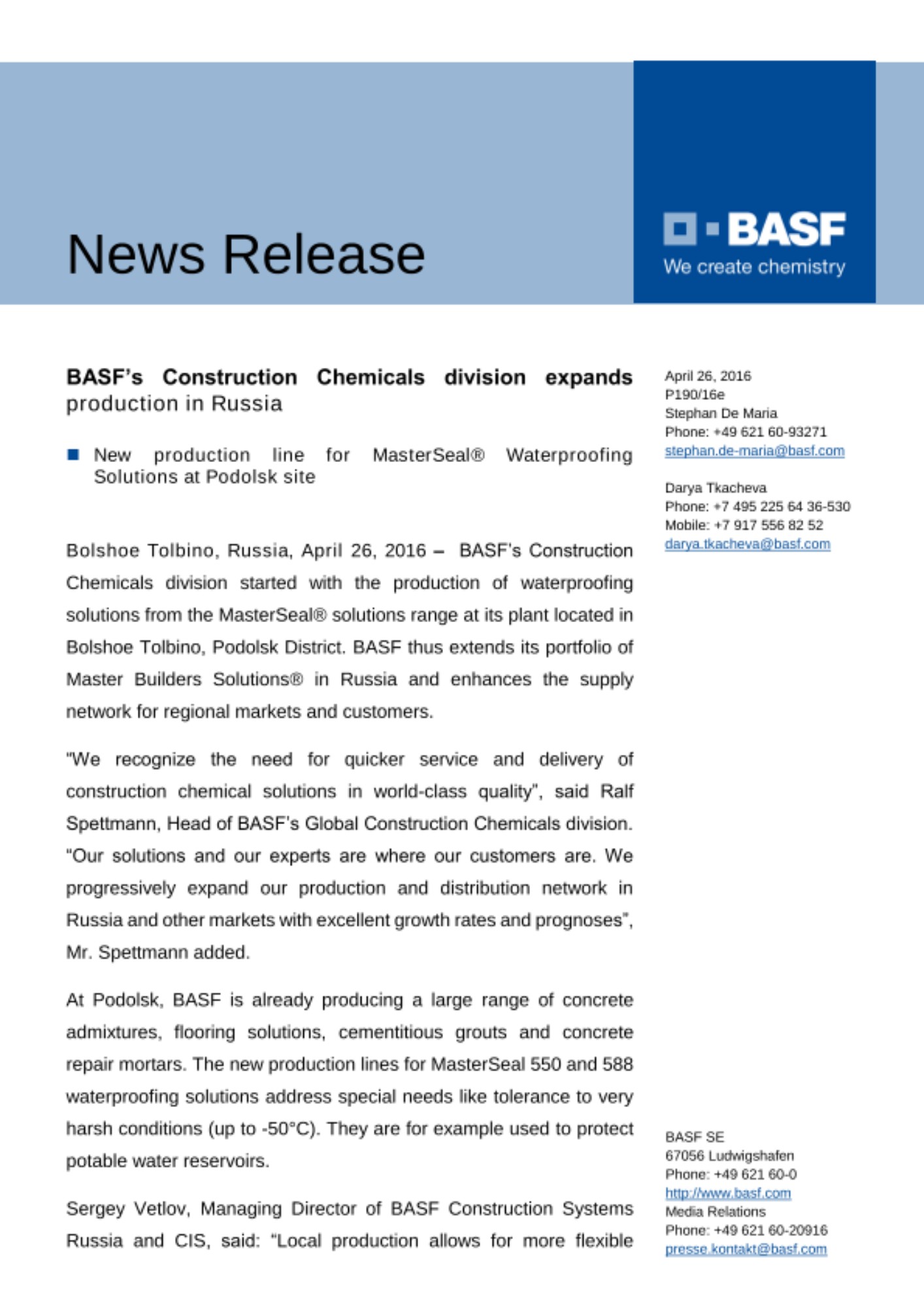 “We recognize the need for quicker service and delivery of construction chemical solutions in world-class quality”, said Ralf Spettmann, Head of BASF’s Global Construction Chemicals division. “Our solutions and our experts are where our customers are. We progressively expand our production and distribution network in Russia and other markets with excellent growth rates and prognoses”, Mr. Spettmann added.