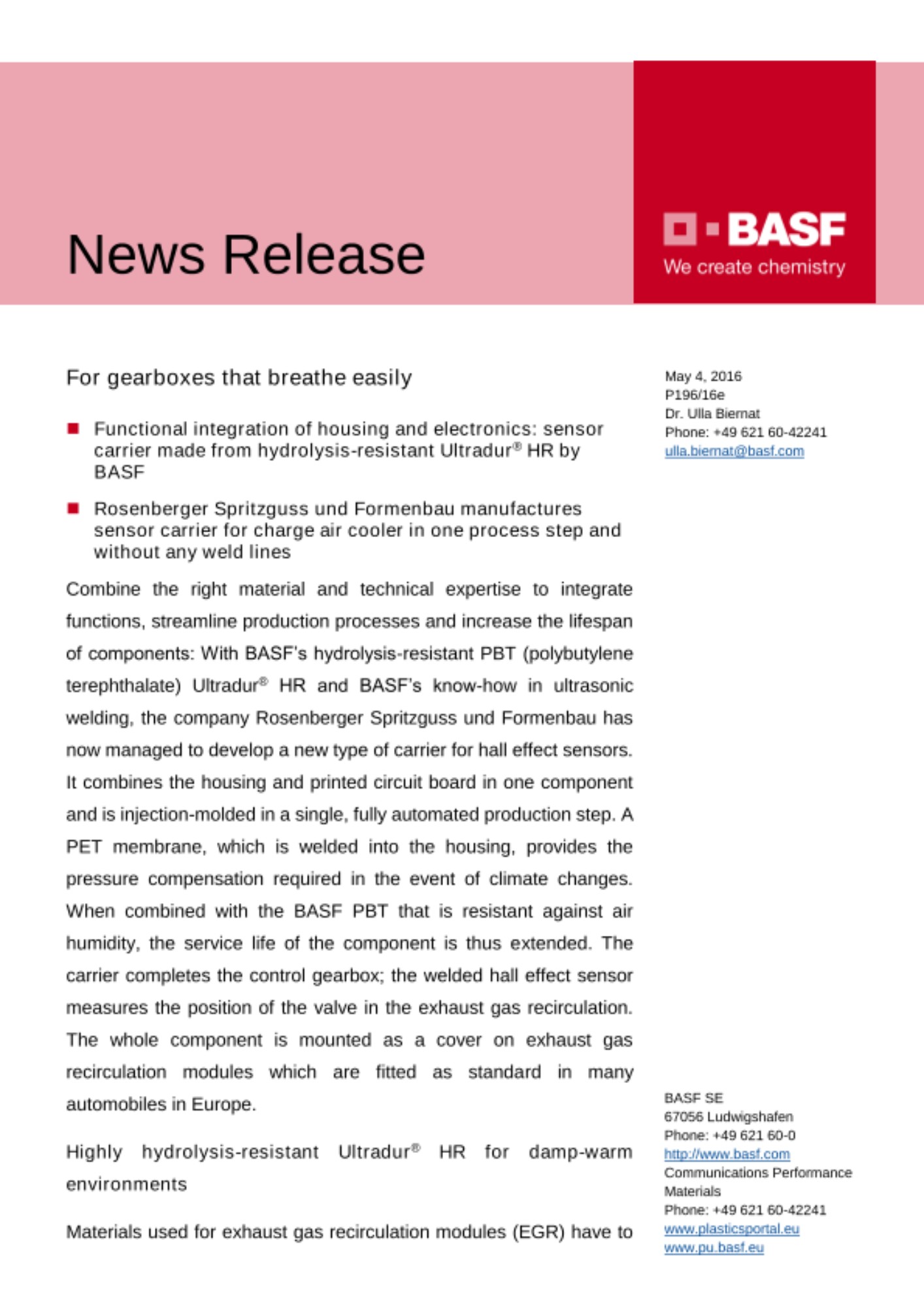 - Functional integration of housing and electronics: sensor carrier made from hydrolysis-resistant Ultradur® HR by BASF