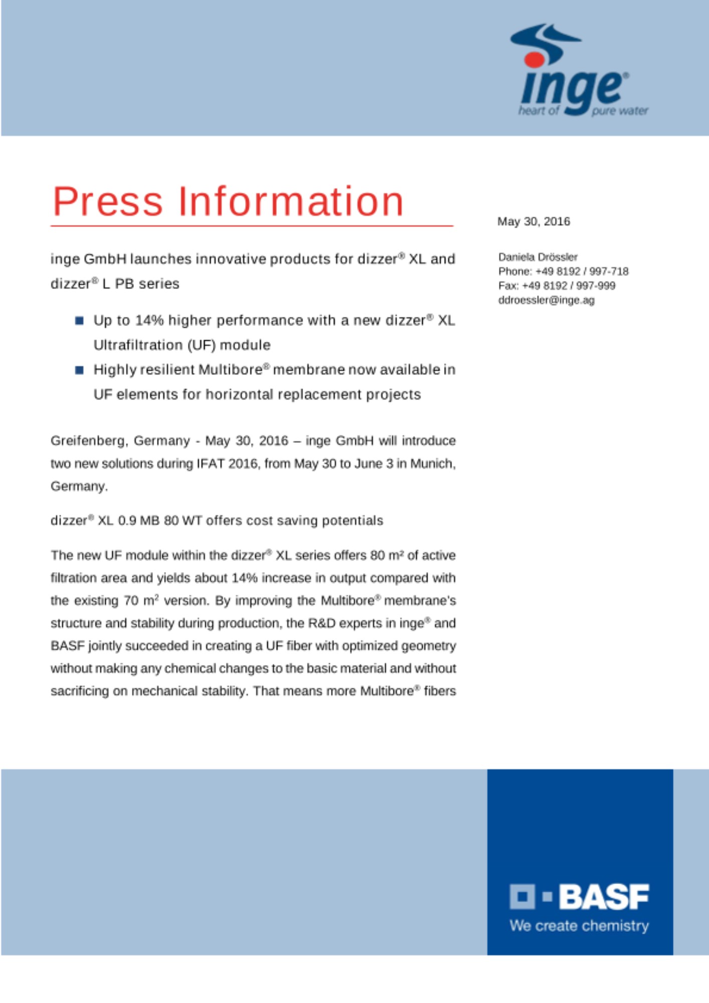 “We are very excited to showcase our latest innovations, in addition to our existing portfolio, at IFAT. Expanding our dizzer® XL series and dizzer® L PB series with new solutions will help customers to save time and costs. Our aim is to always respond to existing market requests as well as to identify new market segments for the future.” said Dr. Peter Berg, Chief Technology Officer, inge GmbH. The launch of the two new products reinforces inge®’s commitment to developing sustainable solutions for treating water. Daniela Calleri, Managing Director, inge GmbH added, “Innovations based on effective and efficient research and development are important growth engines for us. Together with BASF, inge® will continue to expand our offerings and strengthen our position as a technology leader in Ultrafiltration.”