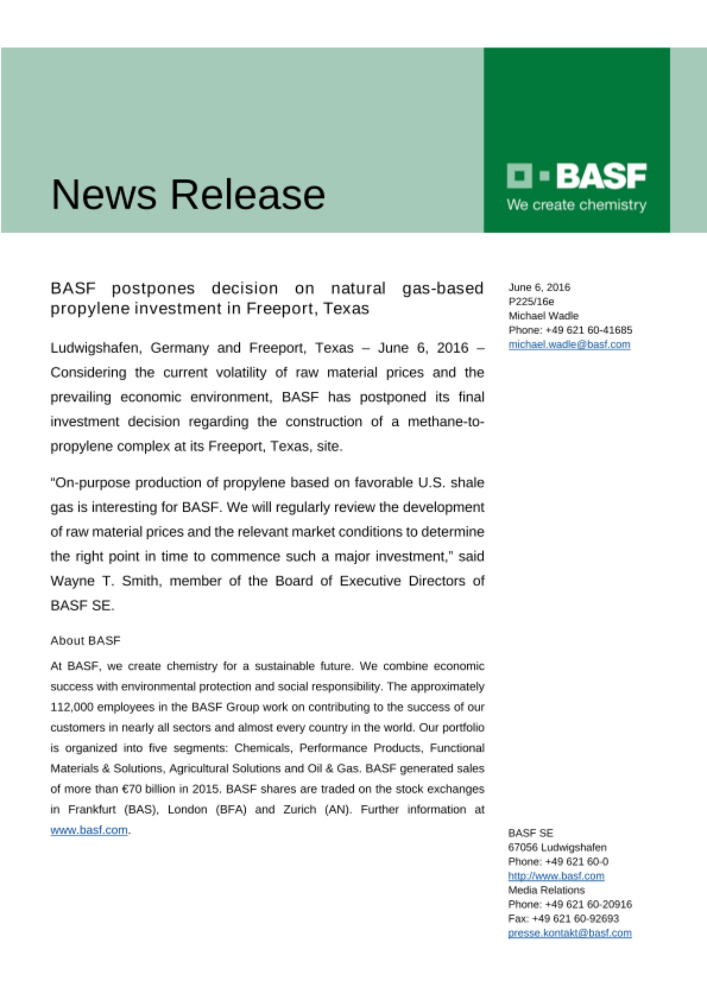 Ludwigshafen, Germany and Freeport, Texas – June 6, 2016 – Considering the current volatility of raw material prices and the prevailing economic environment, BASF has postponed its final investment decision regarding the construction of a methane-to-propylene complex at its Freeport, Texas, site.