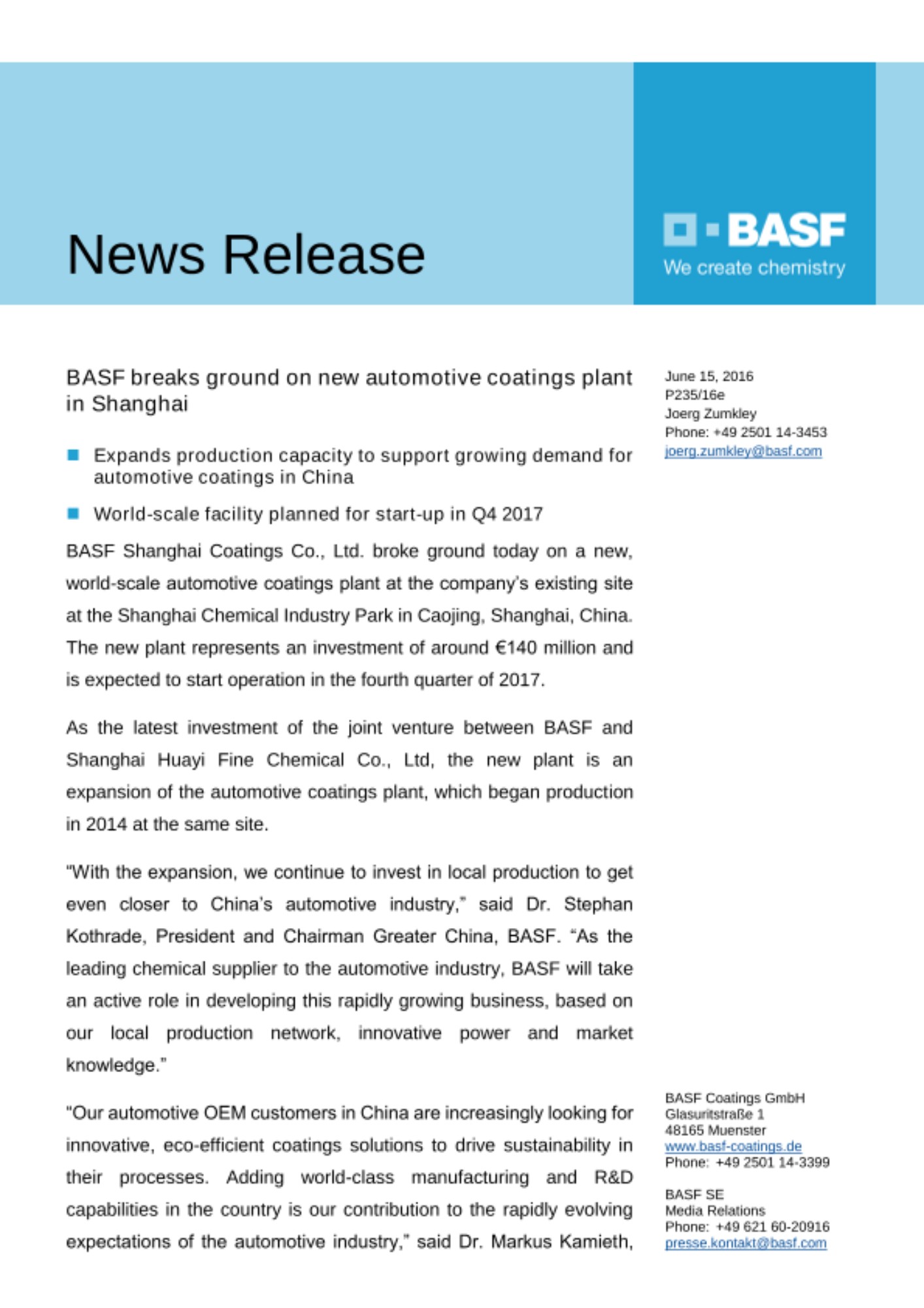 “Our automotive OEM customers in China are increasingly looking for innovative, eco-efficient coatings solutions to drive sustainability in their processes. Adding world-class manufacturing and R&D capabilities in the country is our contribution to the rapidly evolving expectations of the automotive industry,” said Dr. Markus Kamieth, President, Coatings Solutions, BASF. “This new investment in China is another example of our ongoing growth strategy in this region and in our automotive coatings business.”