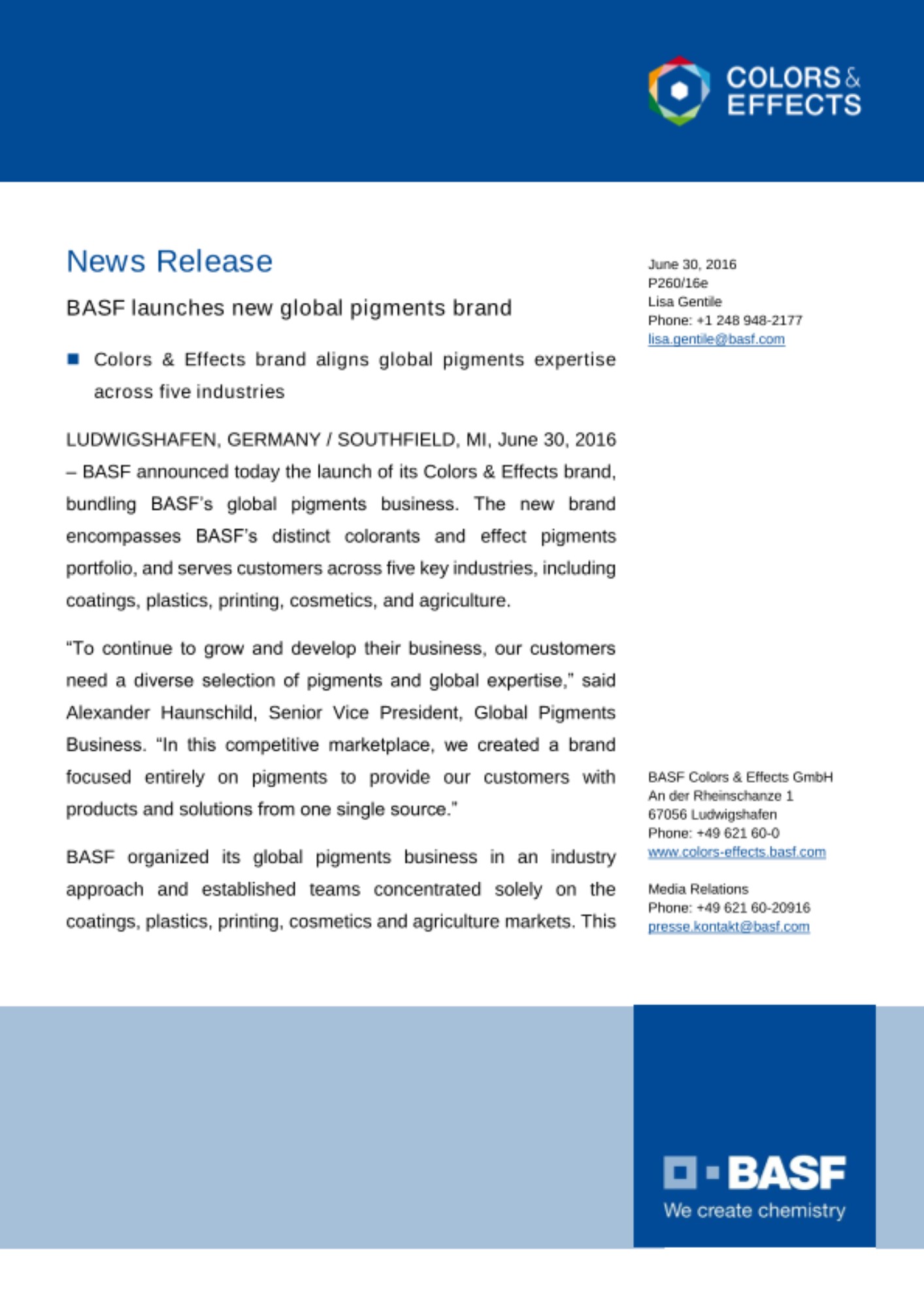 LUDWIGSHAFEN, GERMANY / SOUTHFIELD, MI, June 30, 2016 – BASF announced today the launch of its Colors & Effects brand, bundling BASF’s global pigments business. The new brand encompasses BASF’s distinct colorants and effect pigments portfolio, and serves customers across five key industries, including coatings, plastics, printing, cosmetics, and agriculture.