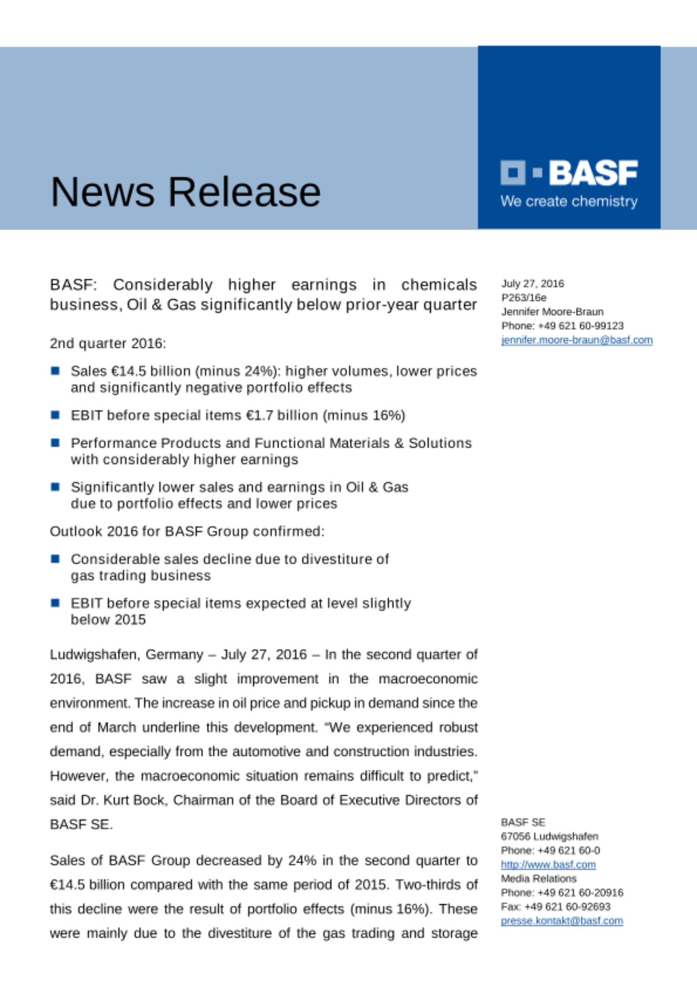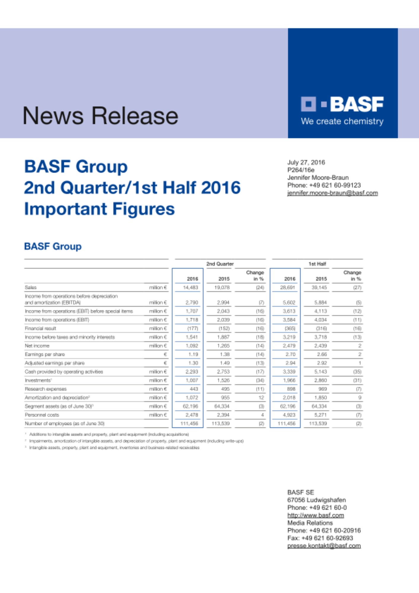 Ludwigshafen, Germany – July 27, 2016 – In the second quarter of 2016, BASF saw a slight improvement in the macroeconomic environment. The increase in oil price and pickup in demand since the end of March underline this development. “We experienced robust demand, especially from the automotive and construction industries. However, the macroeconomic situation remains difficult to predict,” said Dr. Kurt Bock, Chairman of the Board of Executive Directors of BASF SE.