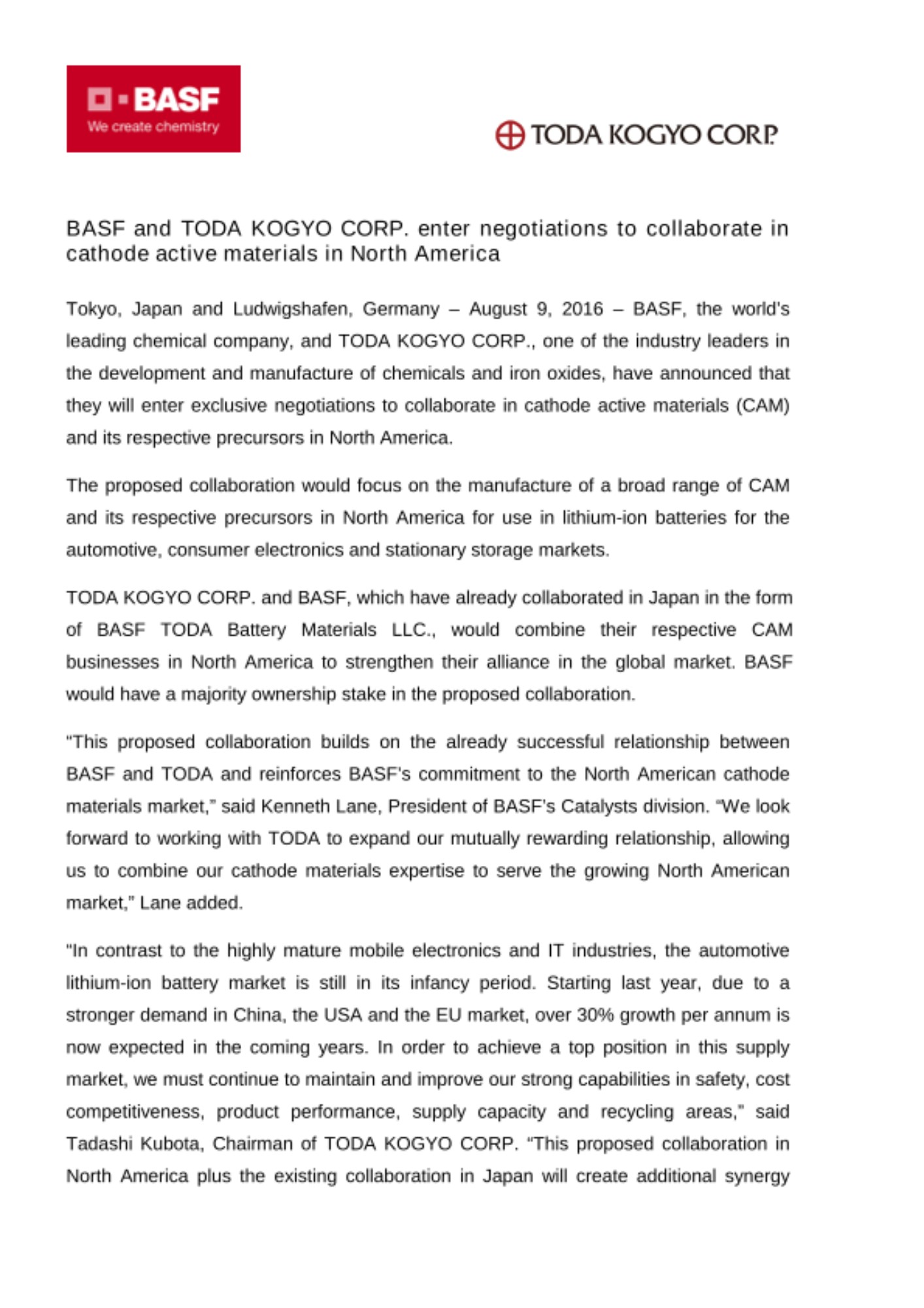 Tokyo, Japan and Ludwigshafen, Germany – August 9, 2016 – BASF, the world’s leading chemical company, and TODA KOGYO CORP., one of the industry leaders in the development and manufacture of chemicals and iron oxides, have announced that they will enter exclusive negotiations to collaborate in cathode active materials (CAM) and its respective precursors in North America.