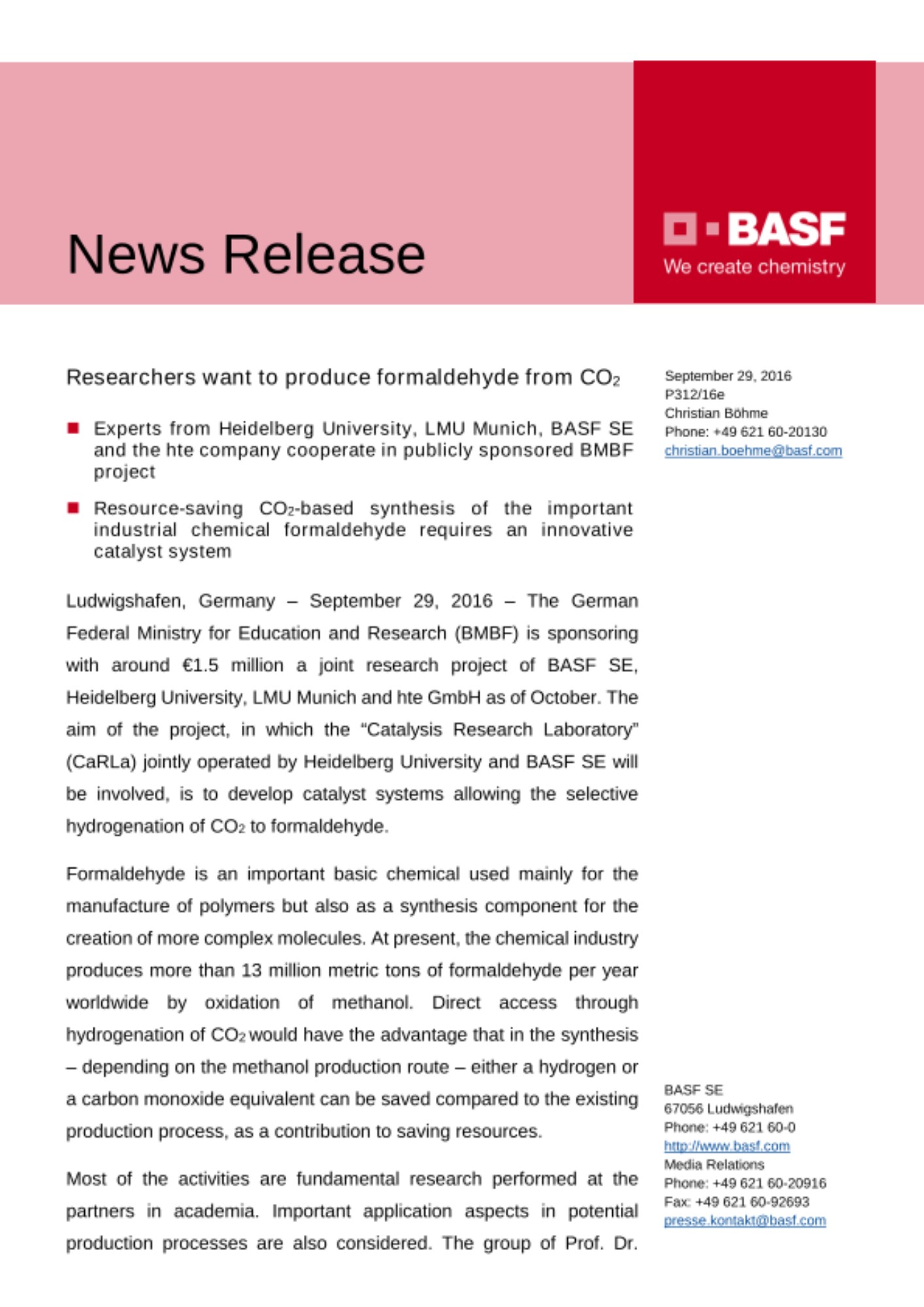 Ludwigshafen, Germany – September 29, 2016 – The German Federal Ministry for Education and Research (BMBF) is sponsoring with around €1.5 million a joint research project of BASF SE, Heidelberg University, LMU Munich and hte GmbH as of October. The aim of the project, in which the “Catalysis Research Laboratory” (CaRLa) jointly operated by Heidelberg University and BASF SE will be involved, is to develop catalyst systems allowing the selective hydrogenation of CO2 to formaldehyde.