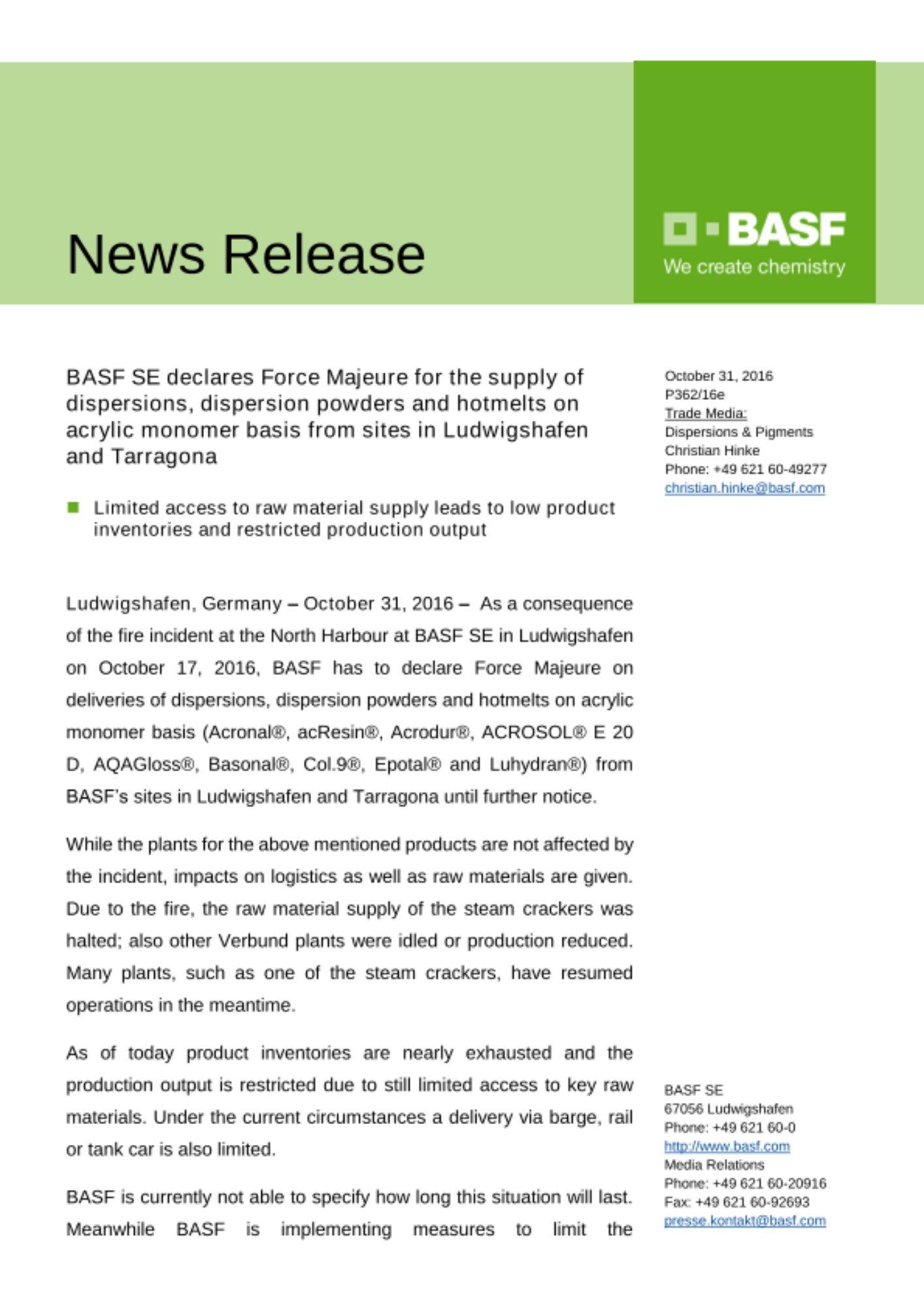 Ludwigshafen, Germany – October 31, 2016 – As a consequence of the fire incident at the North Harbour at BASF SE in Ludwigshafen on October 17, 2016, BASF has to declare Force Majeure on deliveries of dispersions, dispersion powders and hotmelts on acrylic monomer basis (Acronal®, acResin®, Acrodur®, ACROSOL® E 20 D, AQAGloss®, Basonal®, Col.9®, Epotal® and Luhydran®) from BASF’s sites in Ludwigshafen and Tarragona until further notice.
