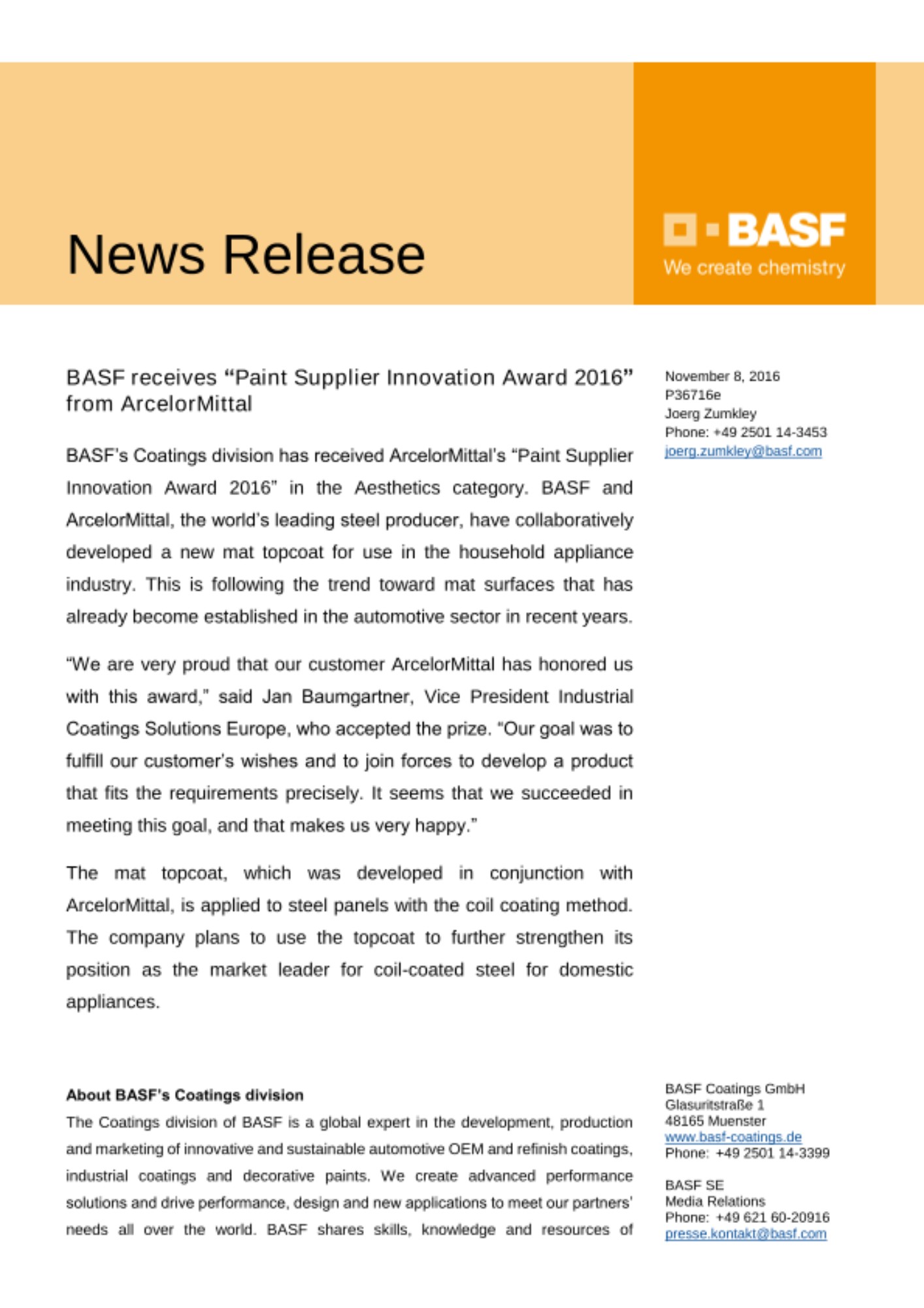 BASF receives “Paint Supplier Innovation Award 2016” from ArcelorMittal